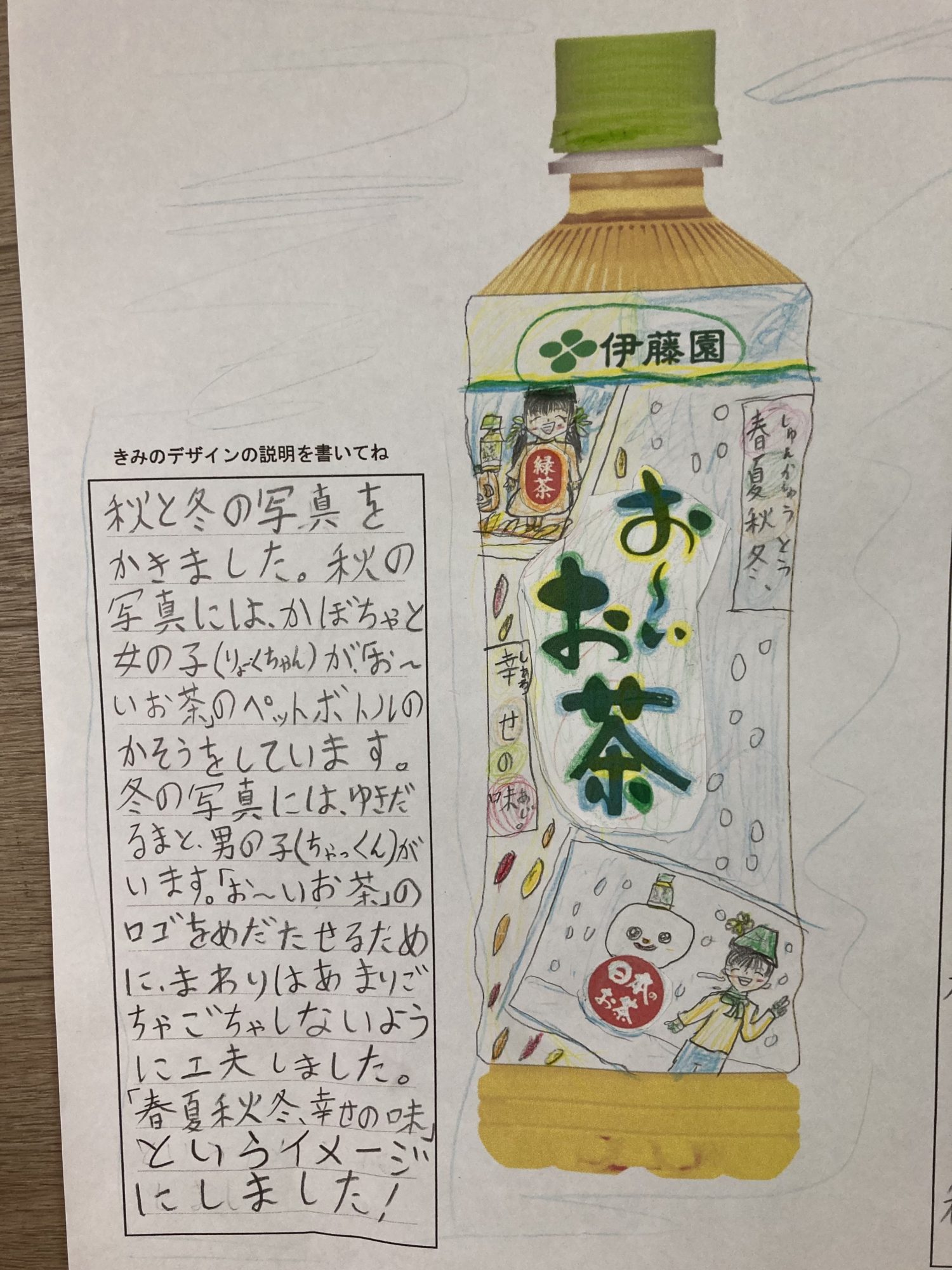 狩野浩之 チャイルドアートサポーター2021年7月4日 10:39 AM お〜いお茶のパッケージデザインカリキュラムに参加してくれてありがとう! 時間が足りなくて質問に全部答えられなかったけど楽しんでもらえたかな? さっそく素敵なデザインをありがとう! お〜いお茶と女の子、男の子のキャラを一枚の写真で表現するなんていいアイデアだね。 春夏にも使えそうだね。 ログインして返信する ↓