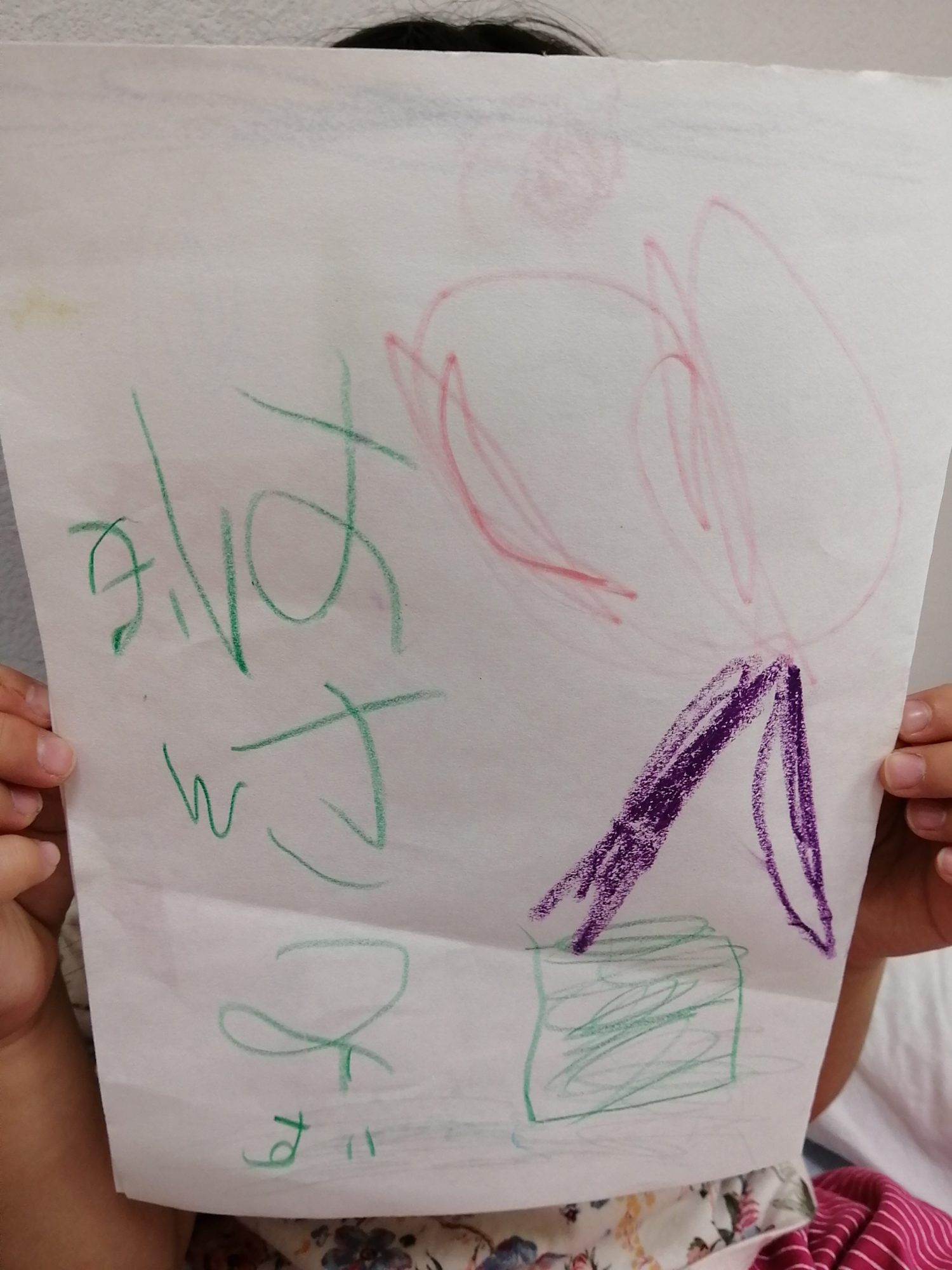 ゆうかちゃん! おりがみをはさみでいっぱいきって、つくってくれてましたね! そして じもいっぱいかいてくれて、たのしいえほんができたね! げんきいっぱいにつくってくれてうれしいな!