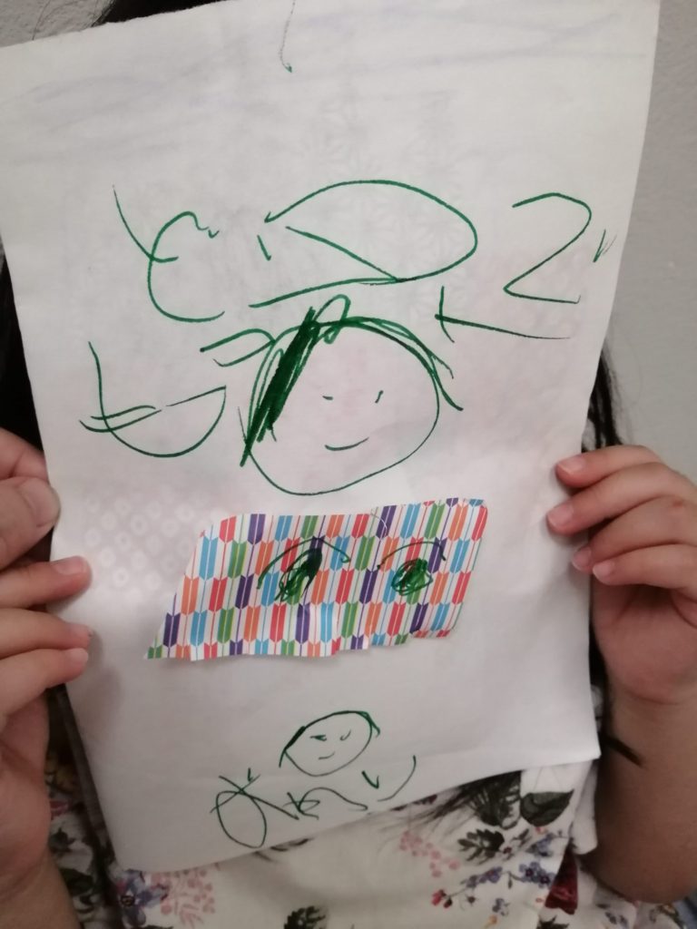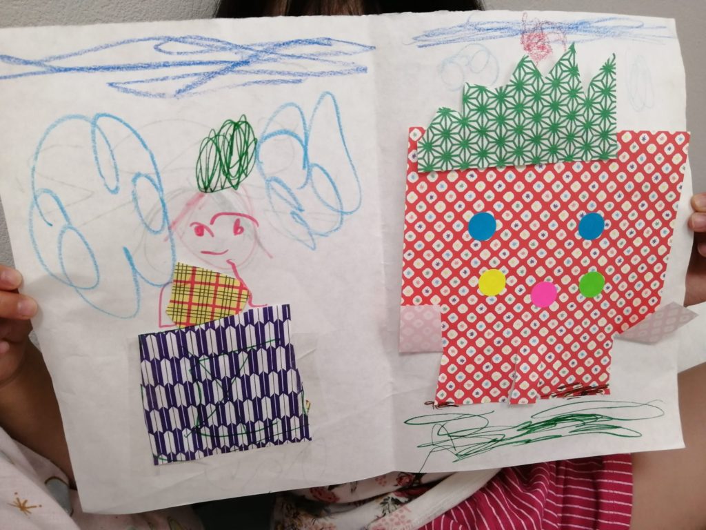 はさみで千代紙の折り紙を切ってポケットや人にしてくれたのかな。