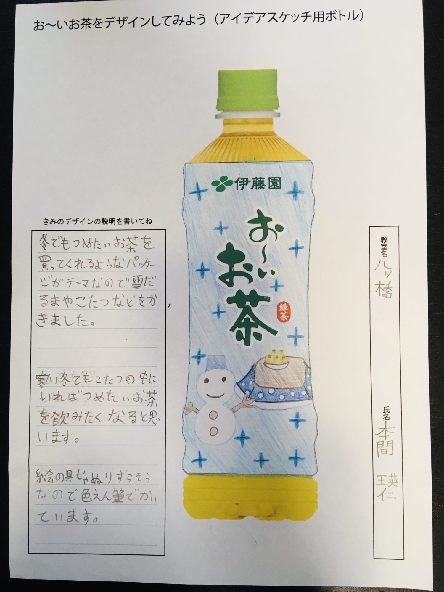 狩野浩之 チャイルドアートサポーター2021年7月4日 11:05 AM お〜いお茶のパッケージデザインカリキュラムに参加してくれてありがとう! 時間が足りなくて質問に全部答えられなかったけど楽しんでもらえたかな? お〜いお茶のロゴもしっかり目立っているし、雪だるまとコタツのイラストも とってもていねいに描けているね! 背景のキラキラパターンも冬のイメージにピッタリ! 完成度の高いステキなデザインだね! ログインして返信する ↓