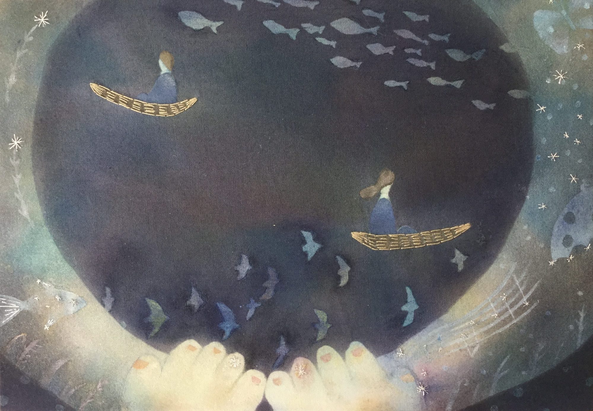 ろうけつ染めとステンシルと刺繍でちいさなちいさな絵を描いています。