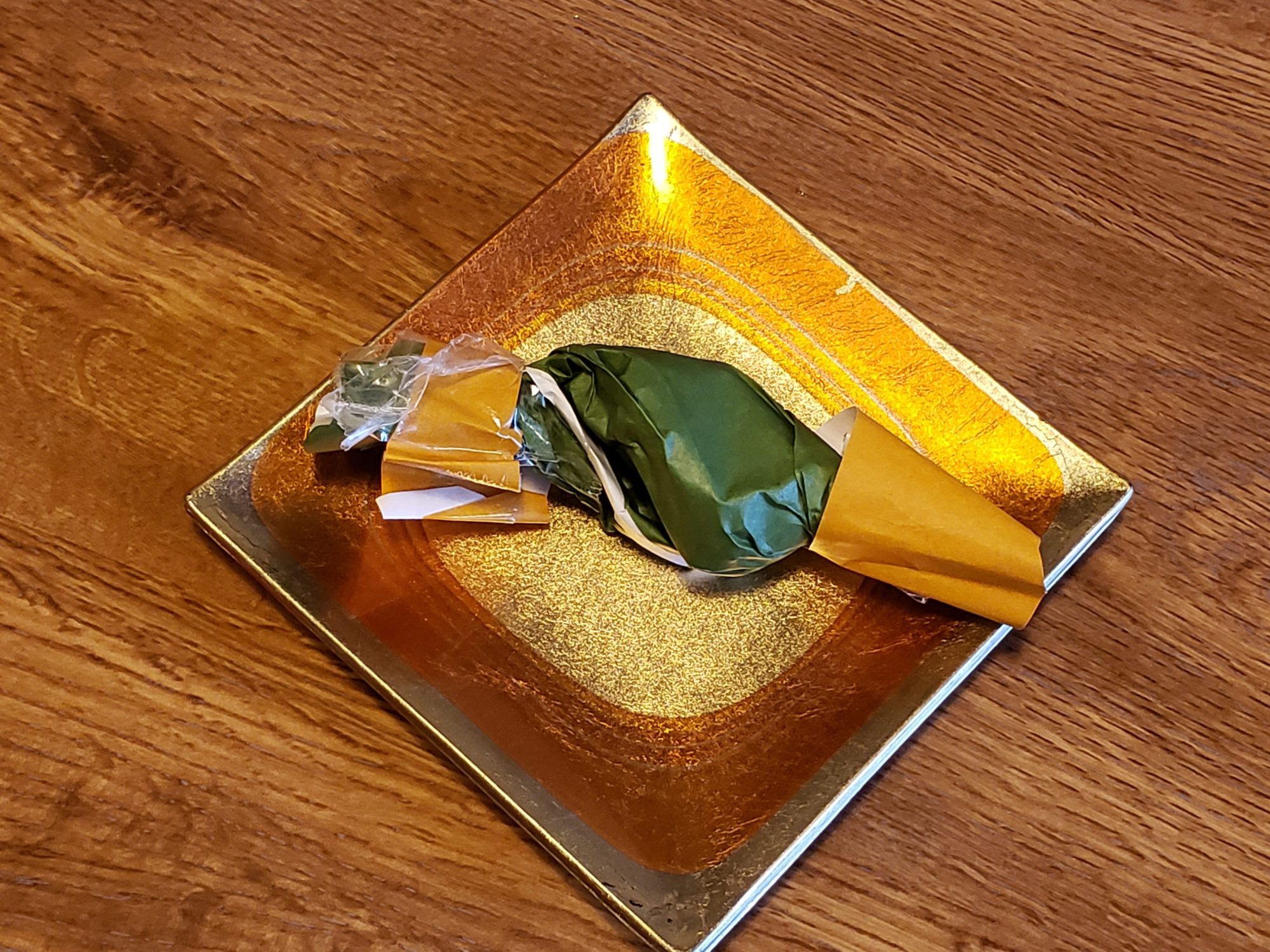 おりがみでつくっているのかな? ささだんごの色合いがゼツミョーにいいですね! お皿の色とすばらしいハーモニーをかなでている!