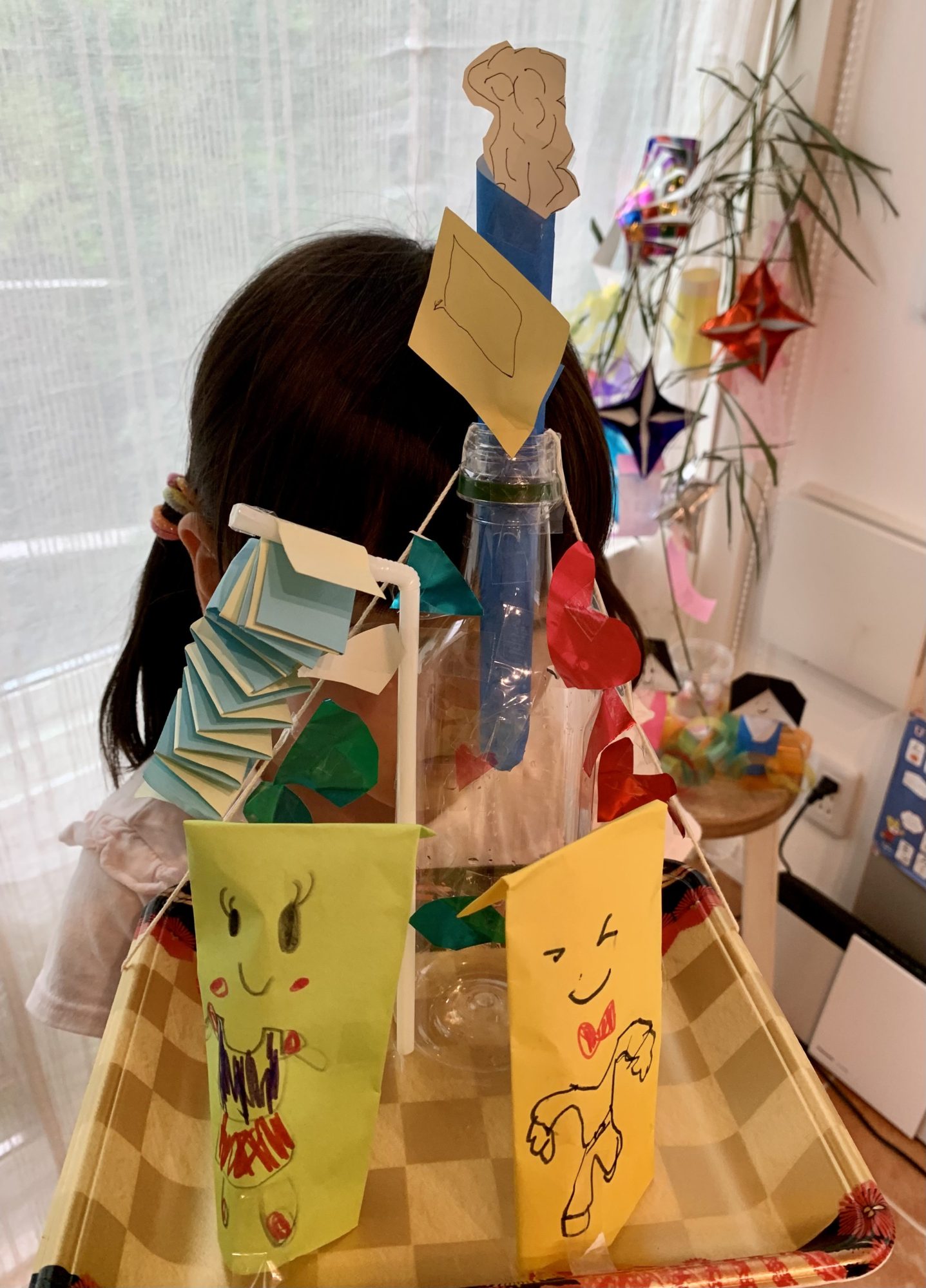 くるみちゃん すごくいろんなかざりをつけたね! これをおふろでうかべたら たのしいよね! うしろにみえてるたなばたかざりもステキだね! おりひめさま、ひこぼしさまがのってるみたいにもみえるね!