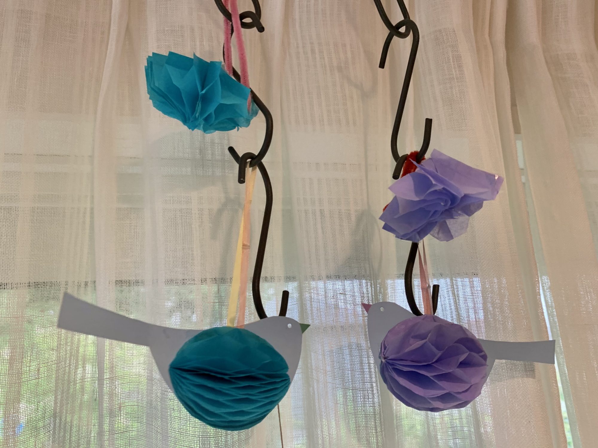ハニカムペーパーの鳥さんは、立体的でおもしろい形ですね!S字フックを活用しているところも魅力的です!