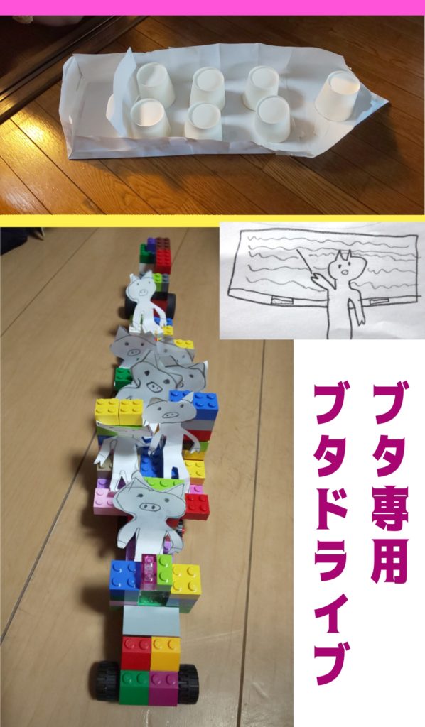 コピー用紙で作ったブタドライブⅠとレゴブロックで作ったブタドライブⅡです。