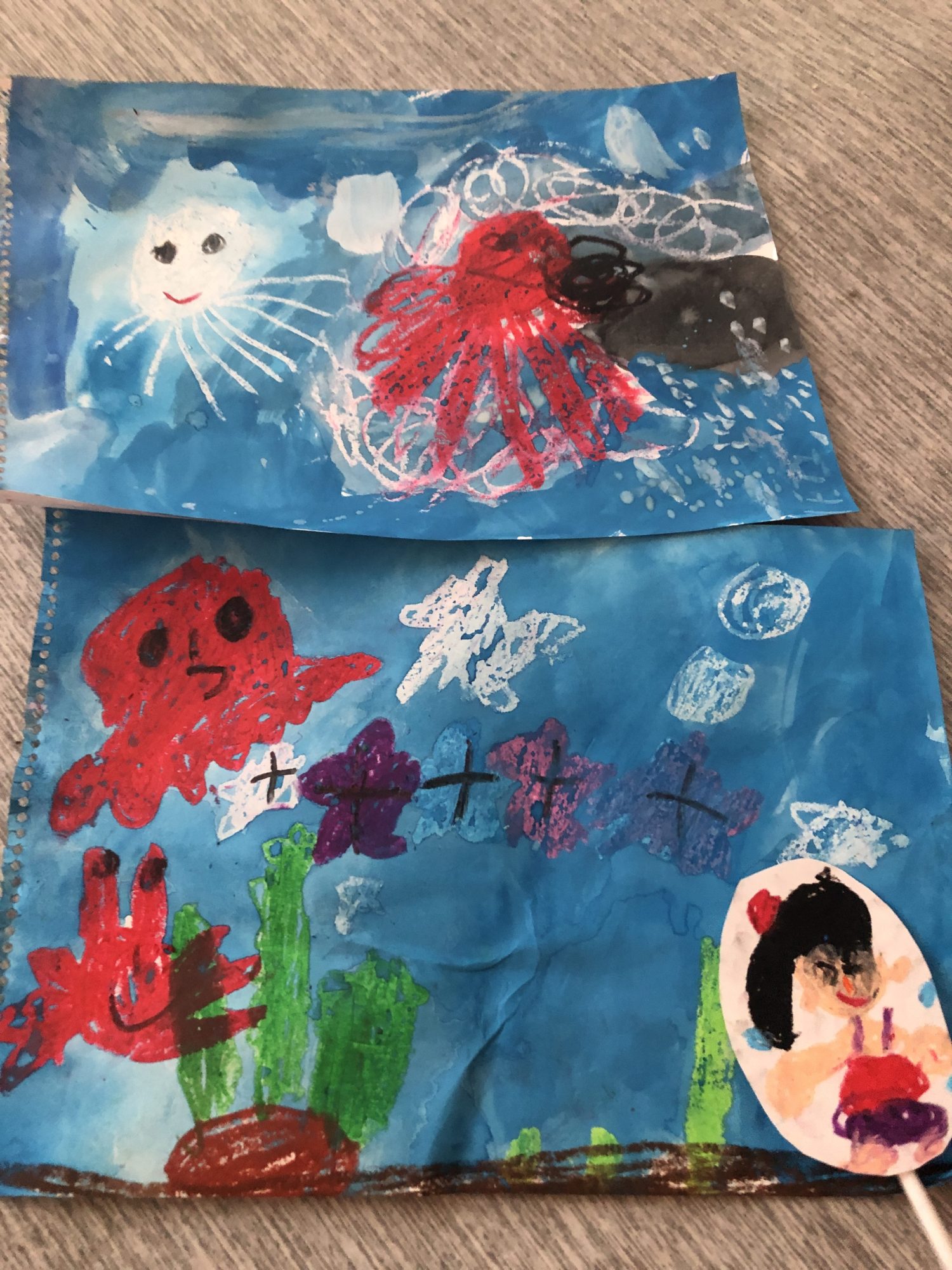 しおりちゃん、ありがとう! カラフルなヒトデがならんでいるんだね。 みずぎをきてもぐっているのは、しおりちゃんかな? タコはくろいすみをだしているのかな!