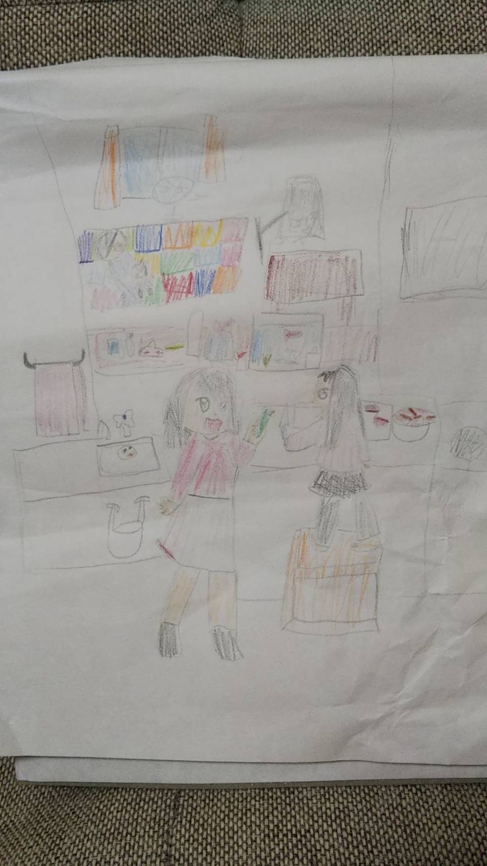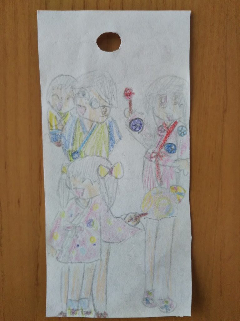 あらら! 絵がとってもステキだ! いきいきしていて、おはなししている声まできこえてきそう! きゅうりとハムのサラダ! 台のうえにのってほうちょうでざいりょうを切ってるんだね! おっこちないように気を付けて! リビングの様子もみえていて、なんかとってもあたたかい絵です。 ゆかたをきておまつりにいっているしおりの絵もたのしそう! いいなあ、いいなあ!