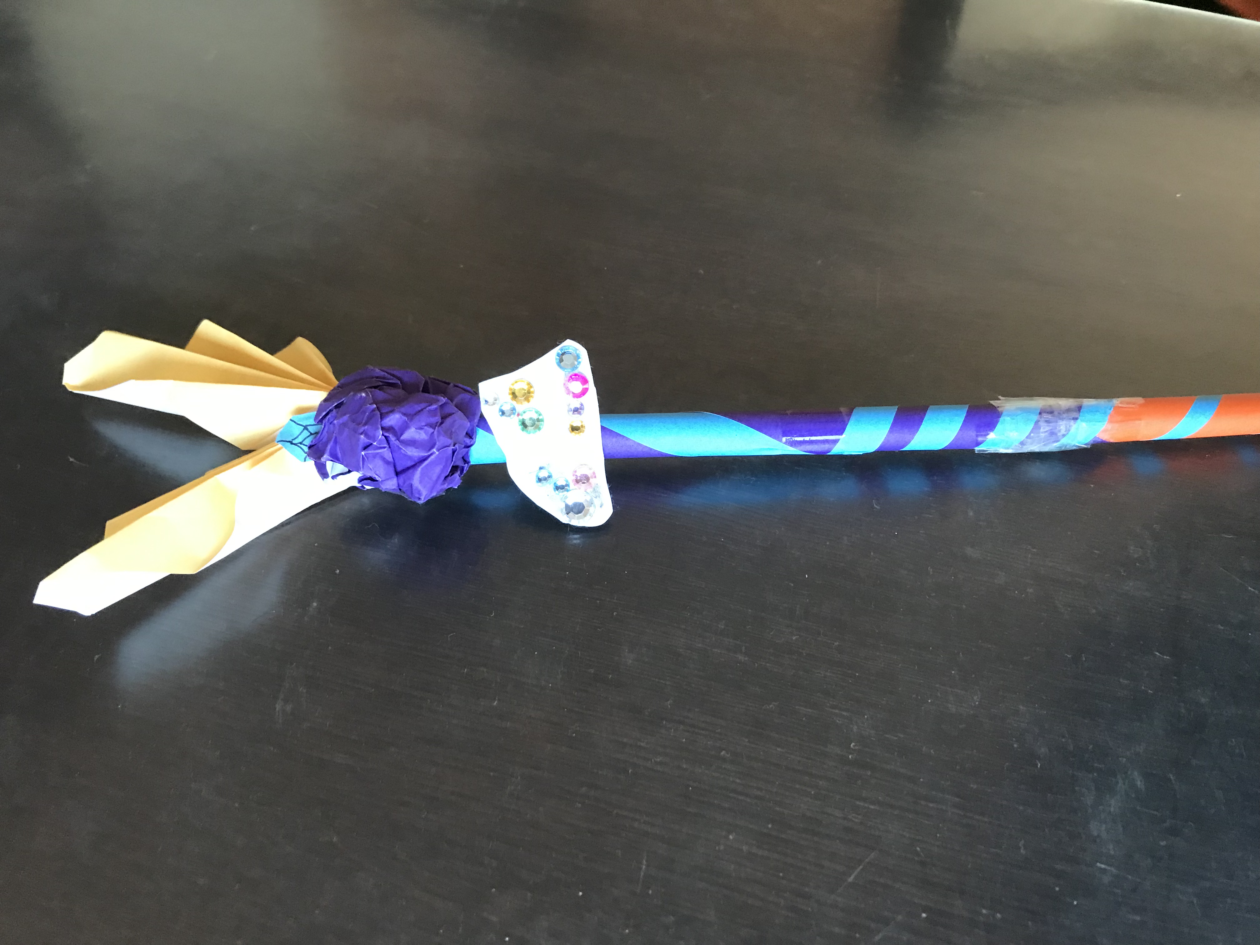 おしゃれでかわいいステッキだね!!色の組み合わせがとってもすてき!飾りもこだわってつくれたね!みーちゃんのまほうのキラキラほうせきパワーで世界中の人を元気にしてください!!