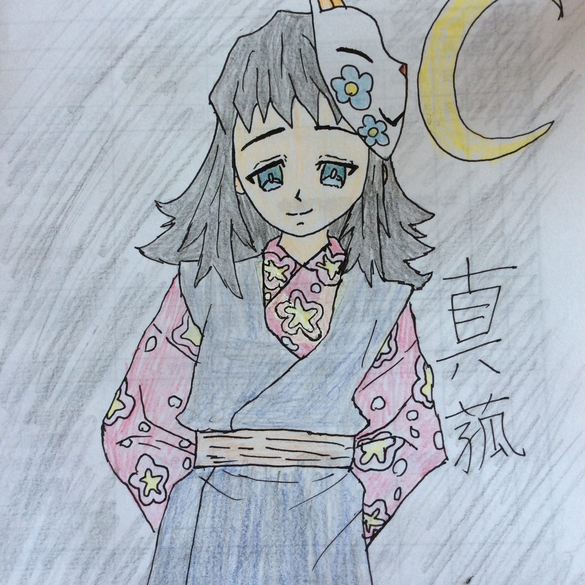 狐のお面を描いたことで、頭の立体感が出せてるね。