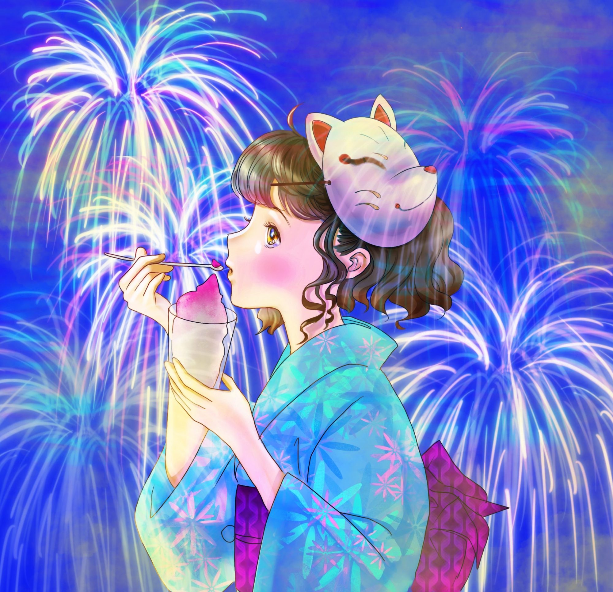 髪の毛の質感と花火の光がめちゃくちゃ綺麗でお祭りの空気を感じます〜〜〜!!!めちゃくちゃ素敵です!!!好きです!!!