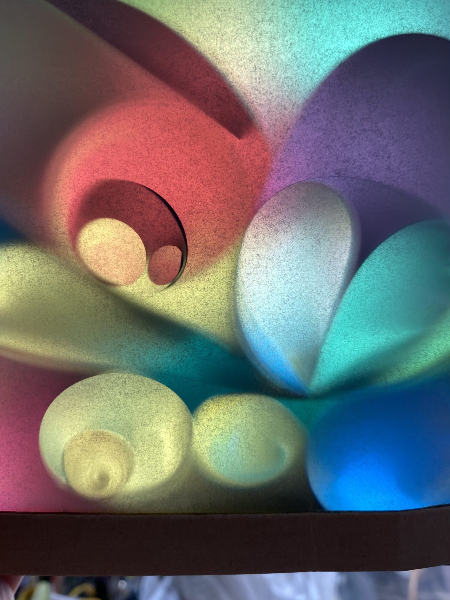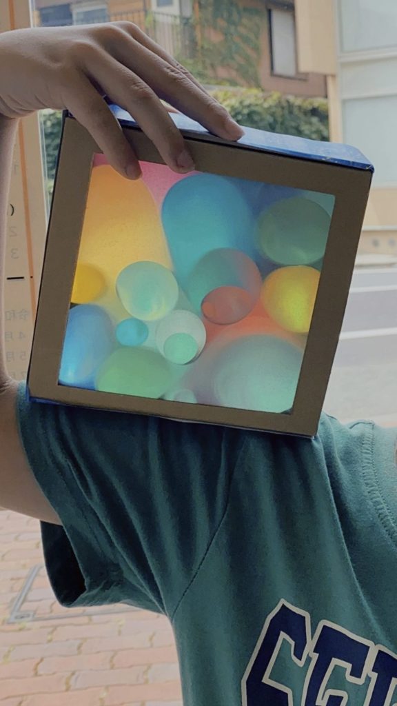 色や大きさの違うセロハンが、光に当たって色が混ざって、たくさんのふくざつな色になっていますね!