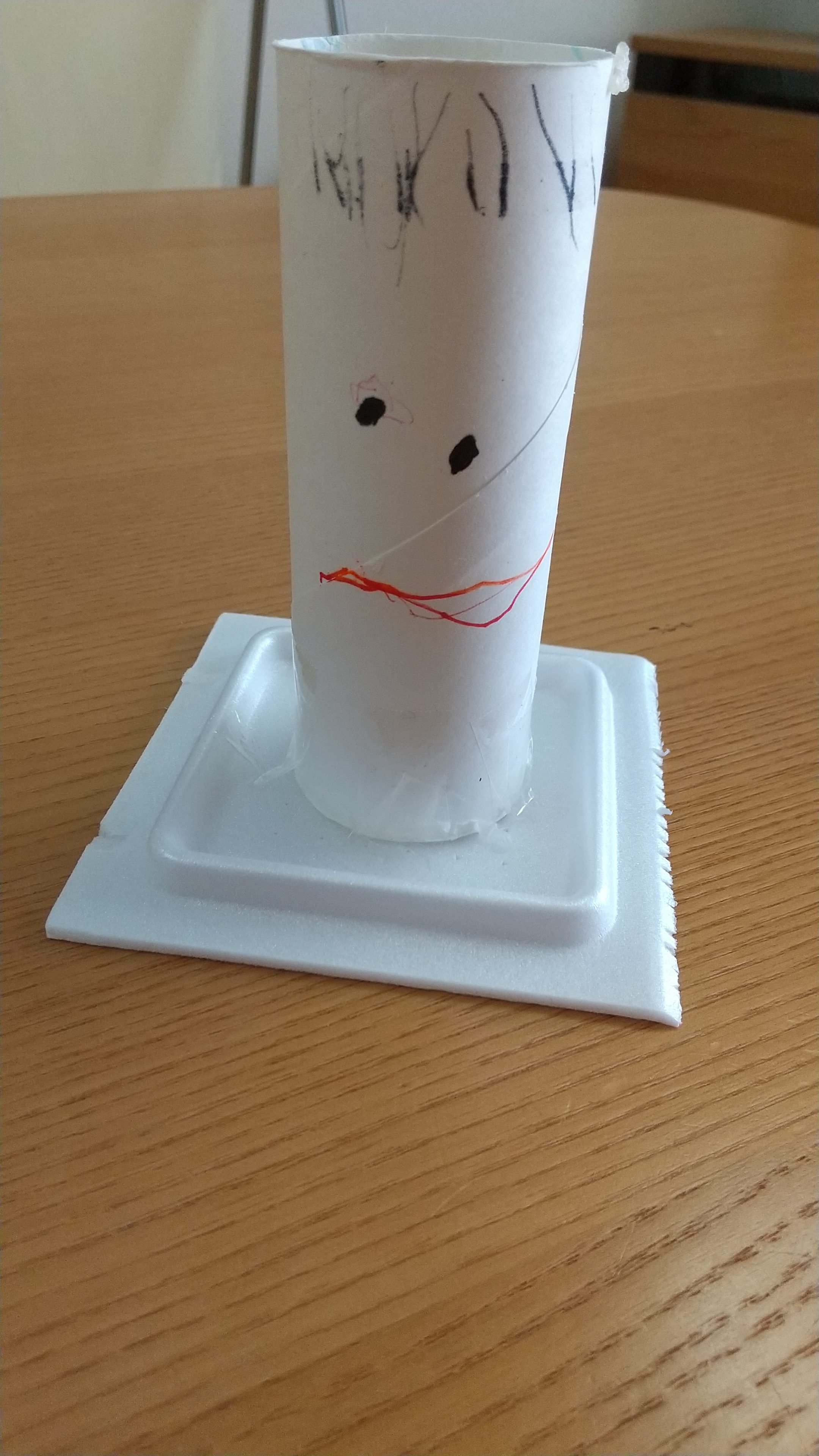 トイレットペーパーの芯と納豆の蓋で作りました。「プリンちゃんが大好きで、みんなプリンちゃんが大好きです。」←娘コメント