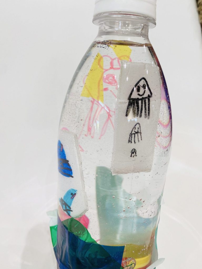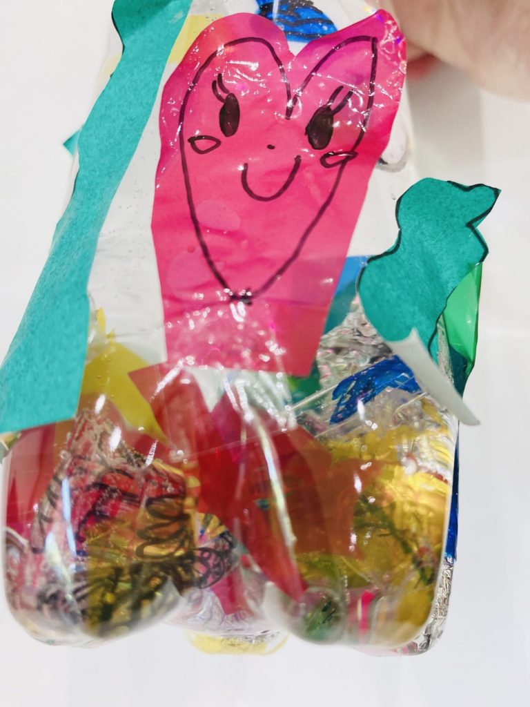 レッスンのまえからいろいろおうちにあるものでじゅんびしていただいたんですね! ほんとうにすばらしい! ペットボトルビーズもきらきらしていて イイですね!