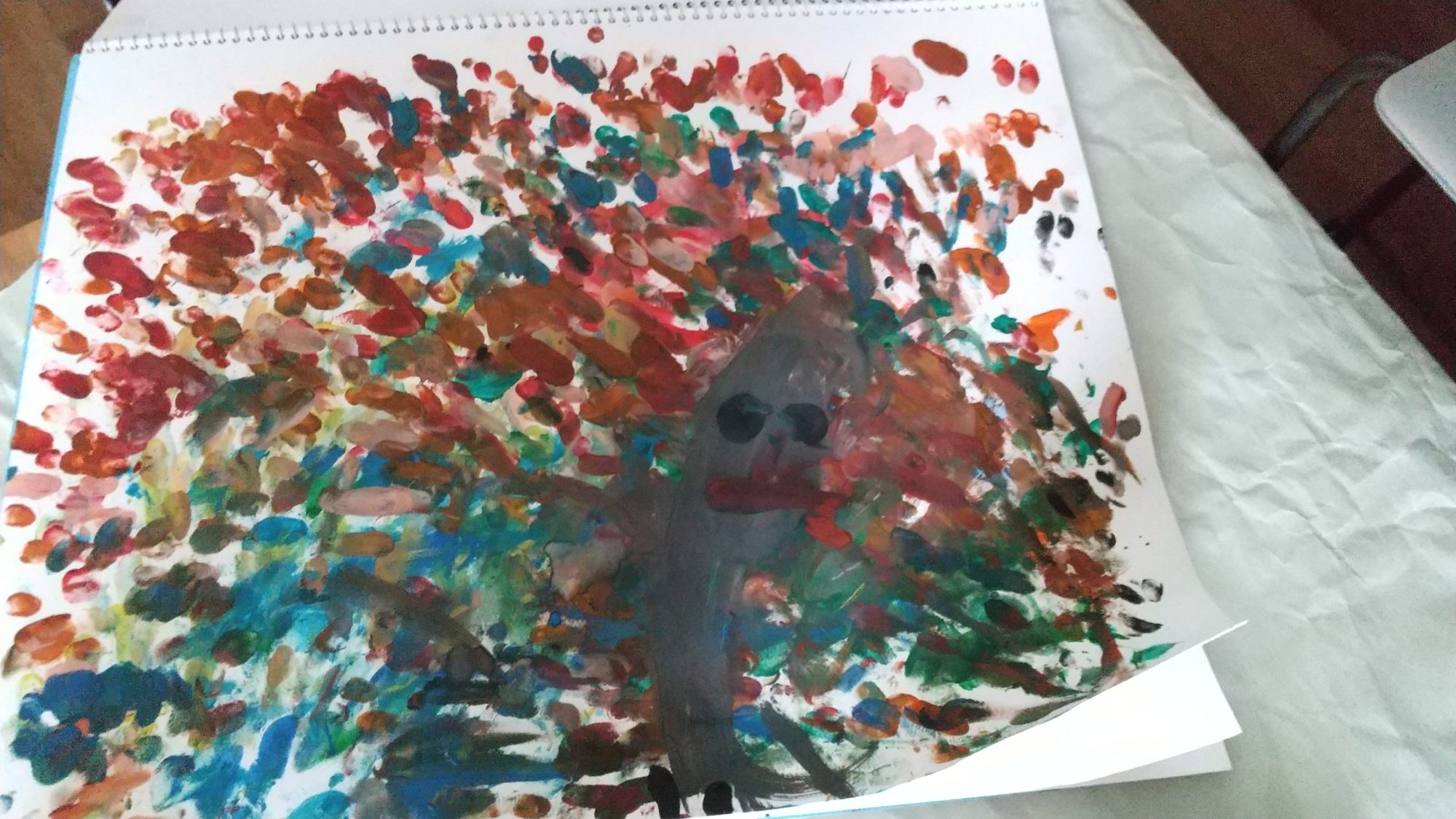 2枚目は手をいっぱい使って花火を描いていたら、真ん中が茶色になっちゃって、目をつけたらくじゃくになっちゃった⭐️