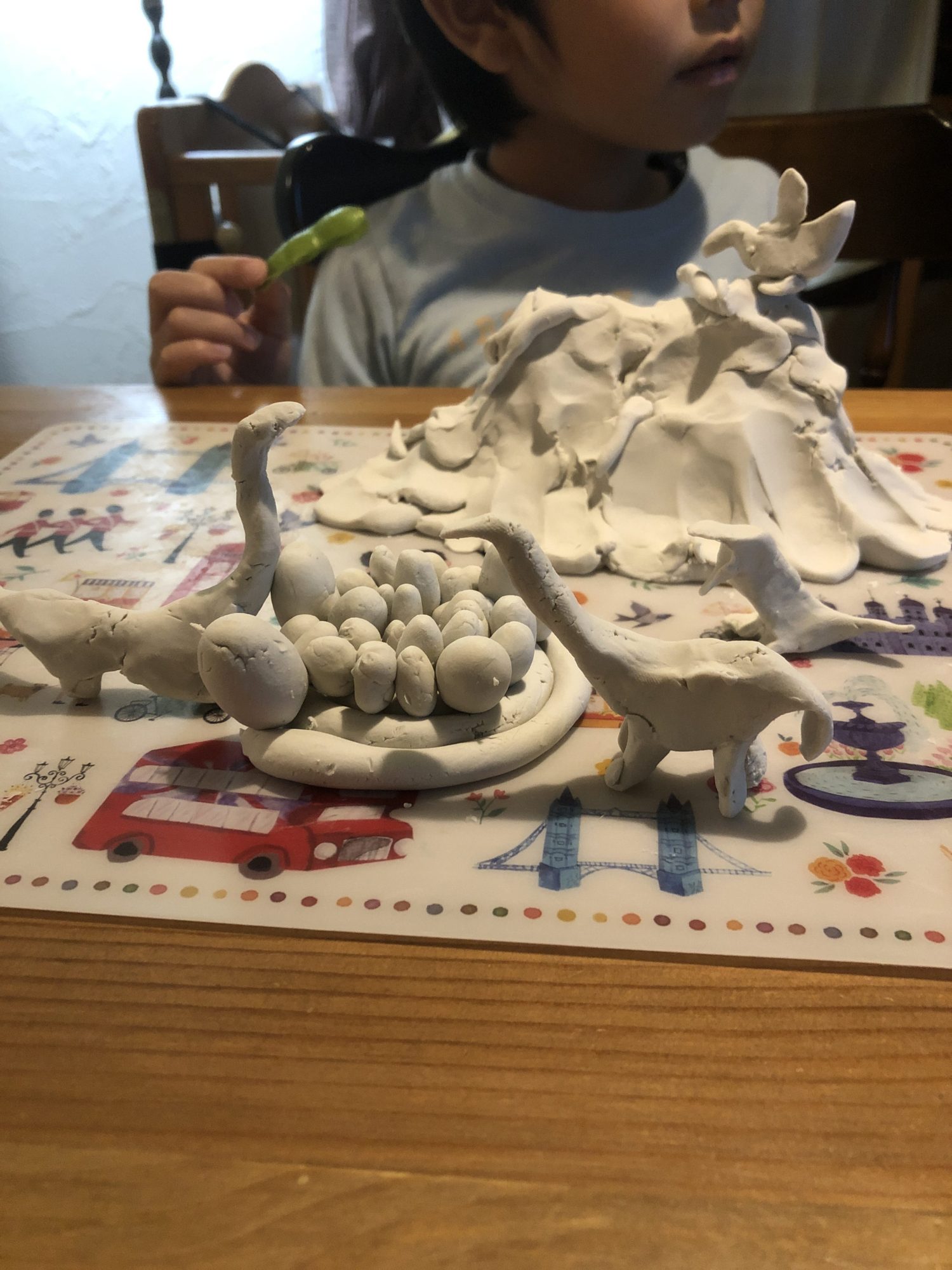 おわああ!! スゴオオイ! これ、ねんどでぜんぶつくったのかあ!! スゴすぎるううう! 火山のふんかまで!! きょうりゅうのじだいにタイムスリップしたみたいだよ!! たまごがわれないようにまもってね!!
