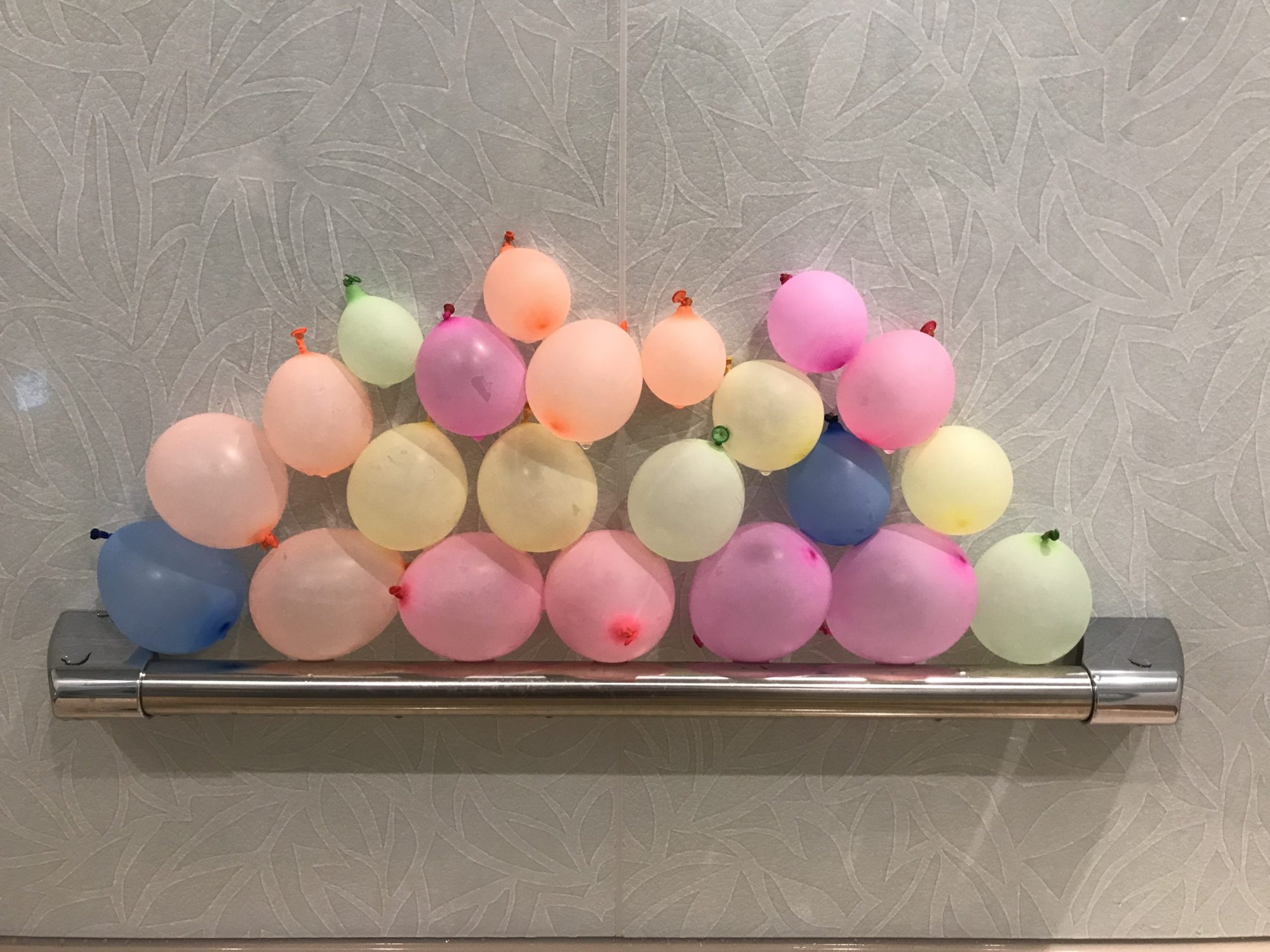可愛らしい水風船の色合いと繊細なバランスで配置されたことによる緊張感が絶妙な調和を生み出していますね。