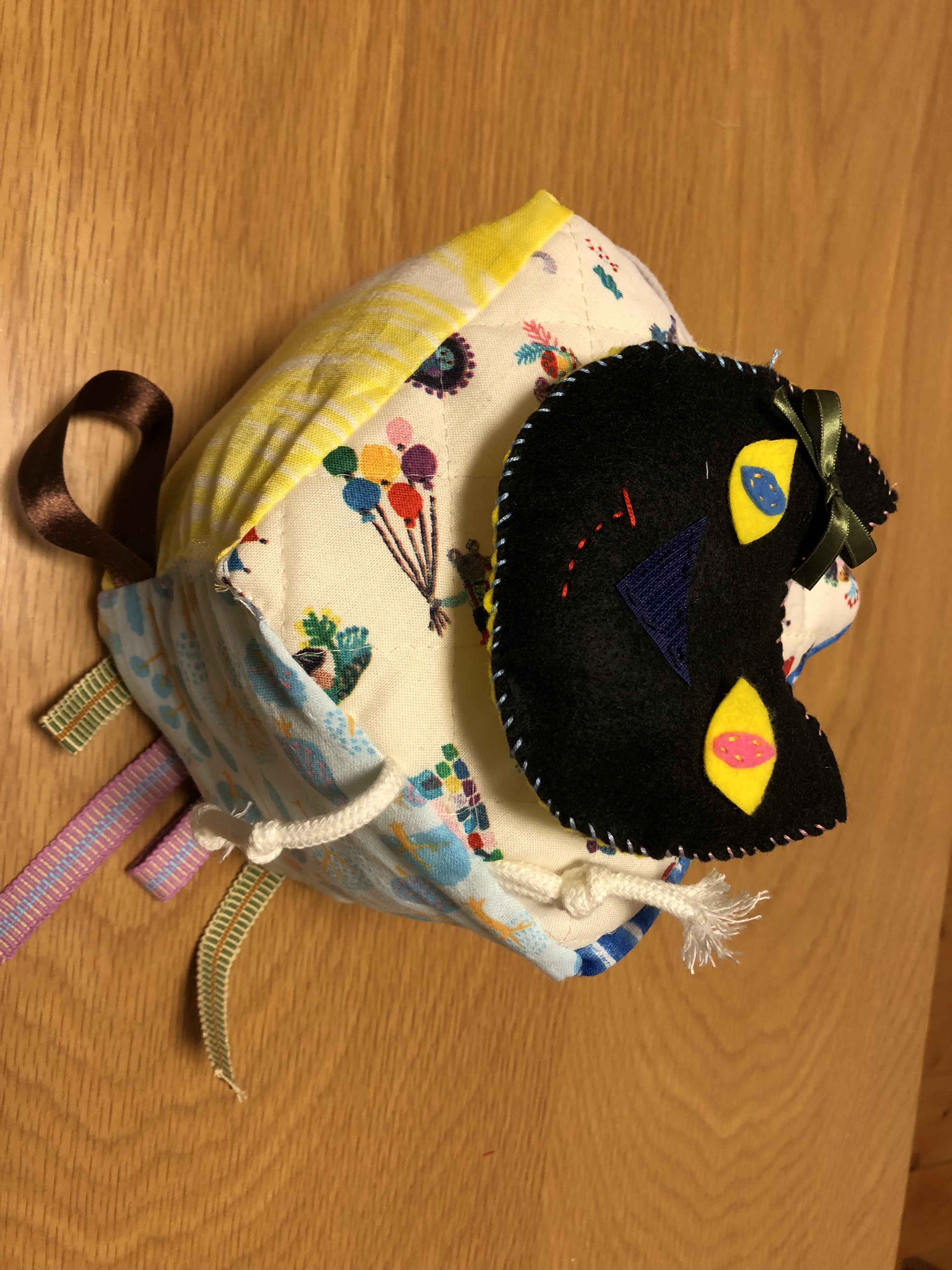しかけがいっぱいついている赤ちゃんのおもちゃを作ったよ!中に入れた鈴がリンリン鳴ります。