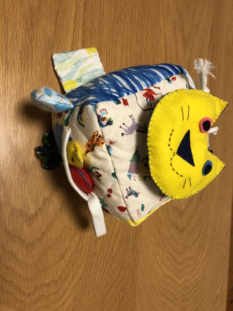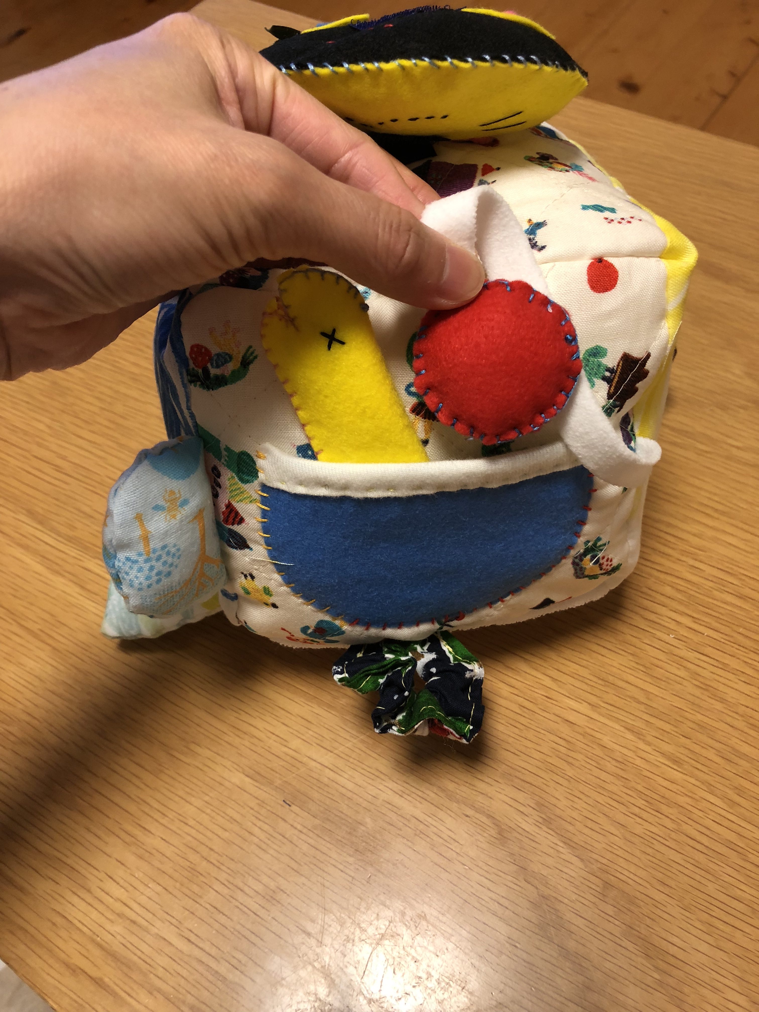 はらぺこあおむしの布で作られたサイコロ状のものに、色々なしかけが付いているおもちゃが売ってるんです、そこからアイデアいただきました!