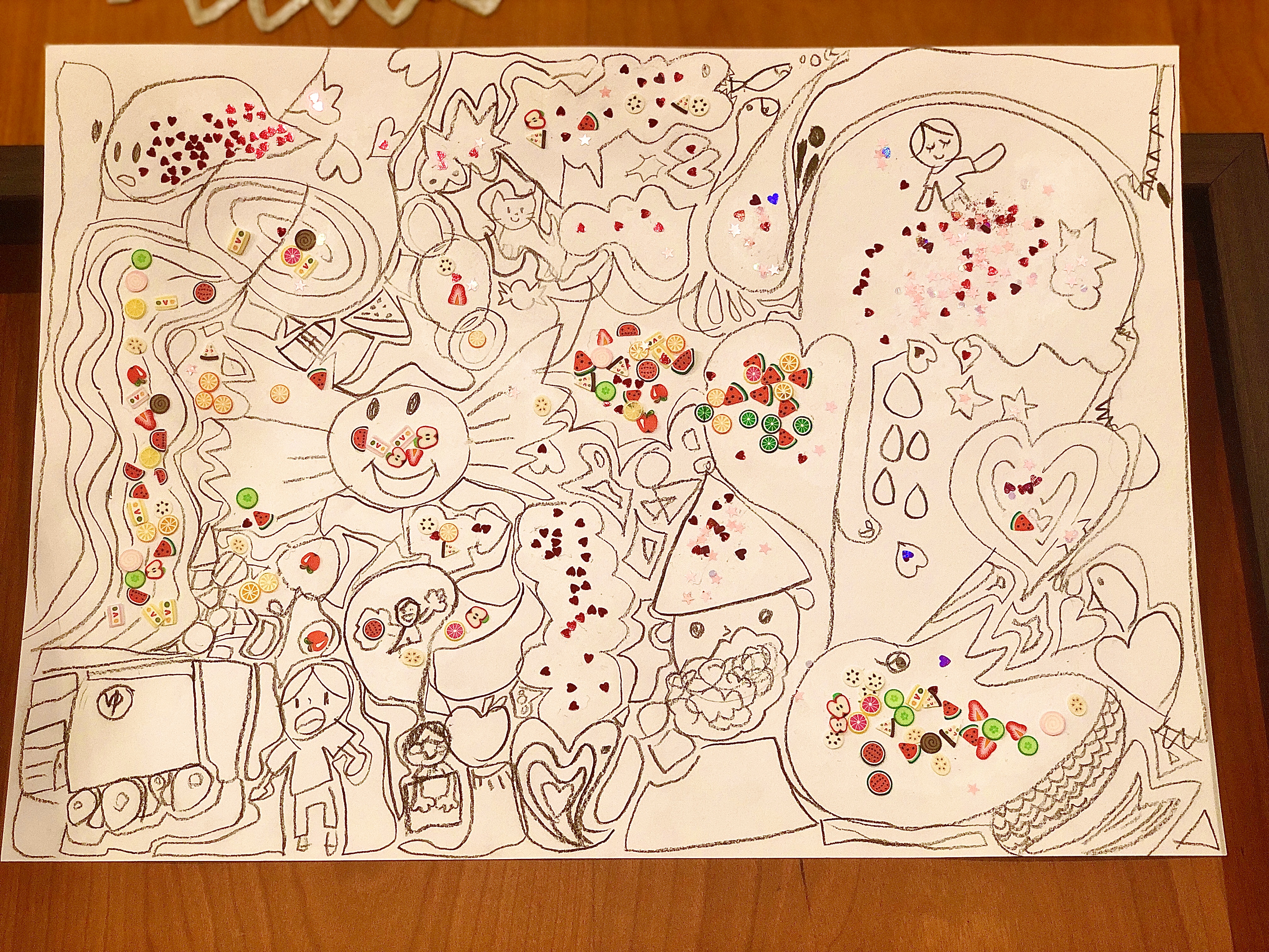 先にラメやフルーツをはってあとからすきまが何のかたちにみえるかかんがえて絵をかきました。