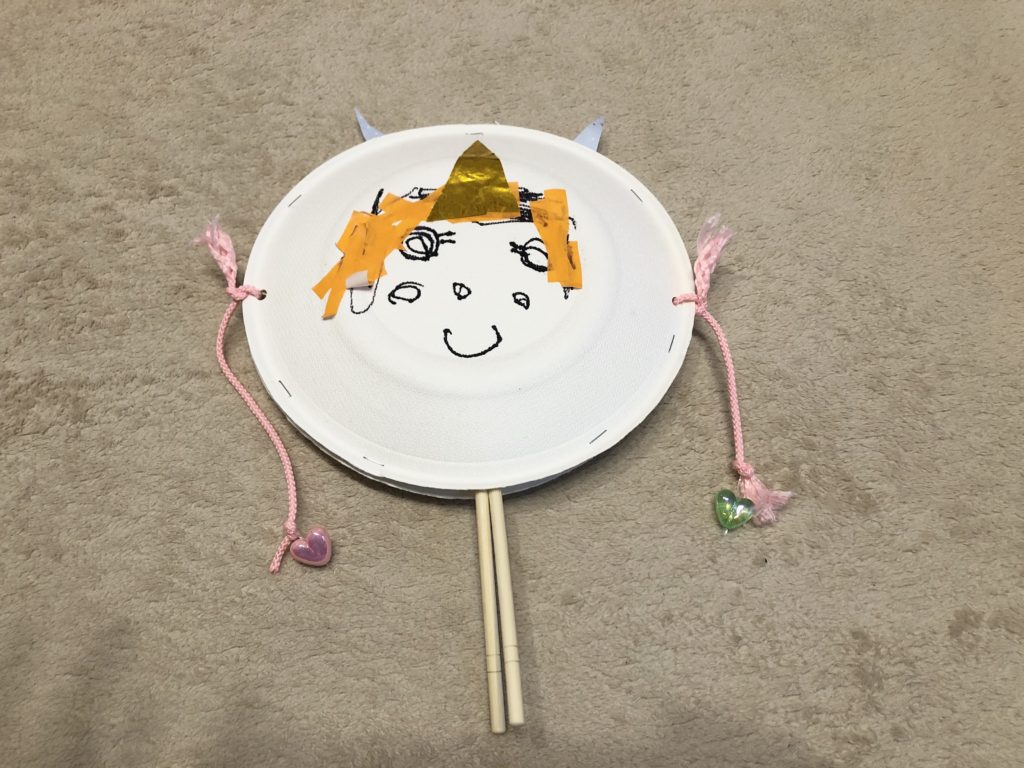 オレンジ鬼にする!と言って折り紙を細長く切り、髪の毛として貼っていました。