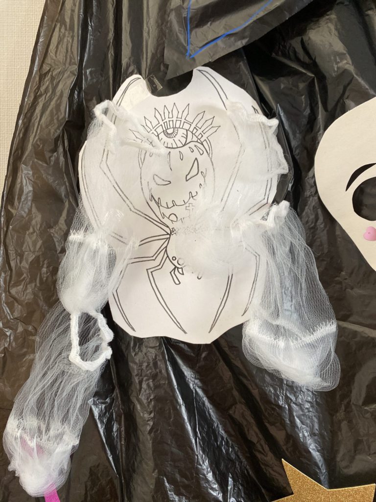 うわあ、すごい! このマントをつけて、ハロウィンパーティしたら、もりあがりますね! みずきりネットでくものすって、ナイスアイデア!