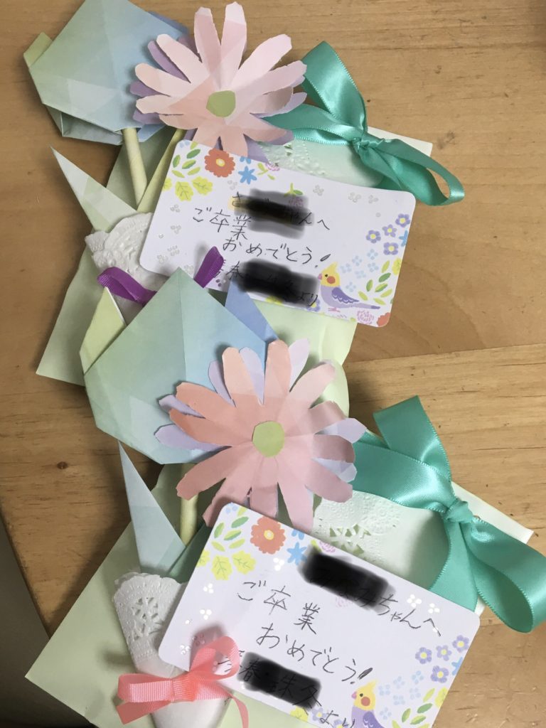 仲良しだった6年生にあげるお菓子に折り紙のお花をつけてラッピングしてみました。