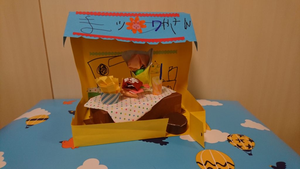食べ物の他に、テーブルやいす、レジ、スタンプで額を作ったり、お店らしさを出すのにこだわりました。