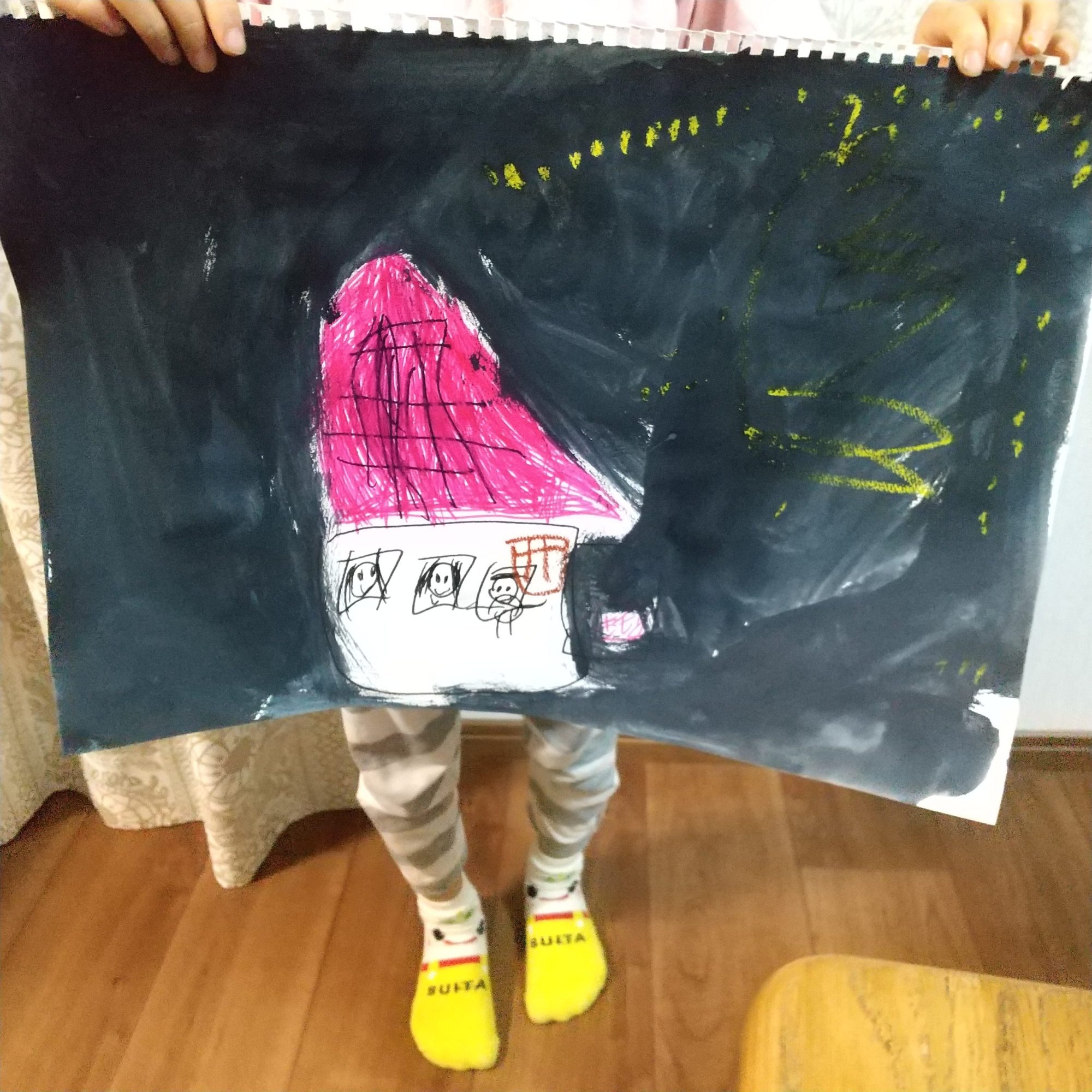 そしたらやりたいが止まらなくなって、絵の具でクリスマスの夜の、オウチも書いちゃた。夜空にはキラキラ星が瞬いてるんだよ