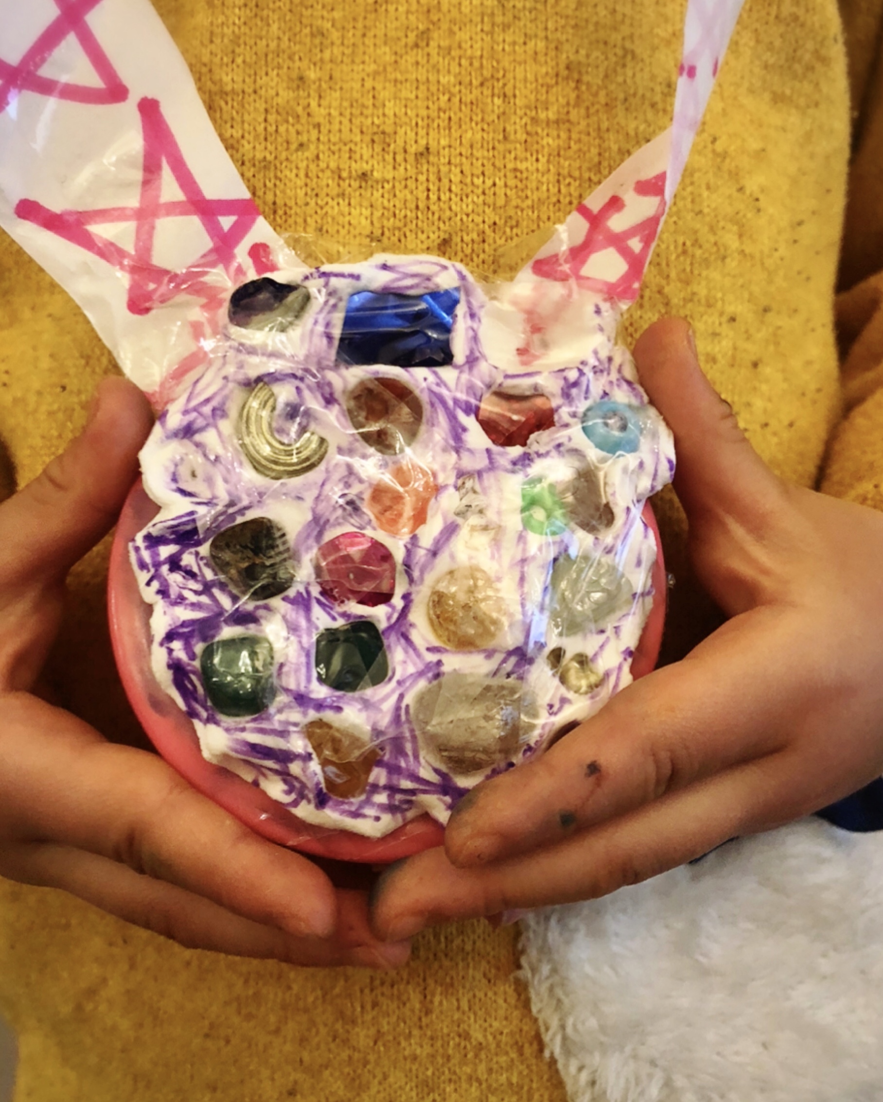 きれいな石や手芸パーツを紙ねんどに埋め込んで丸い手鏡にセロハンテープで貼り張り付けて作りました!