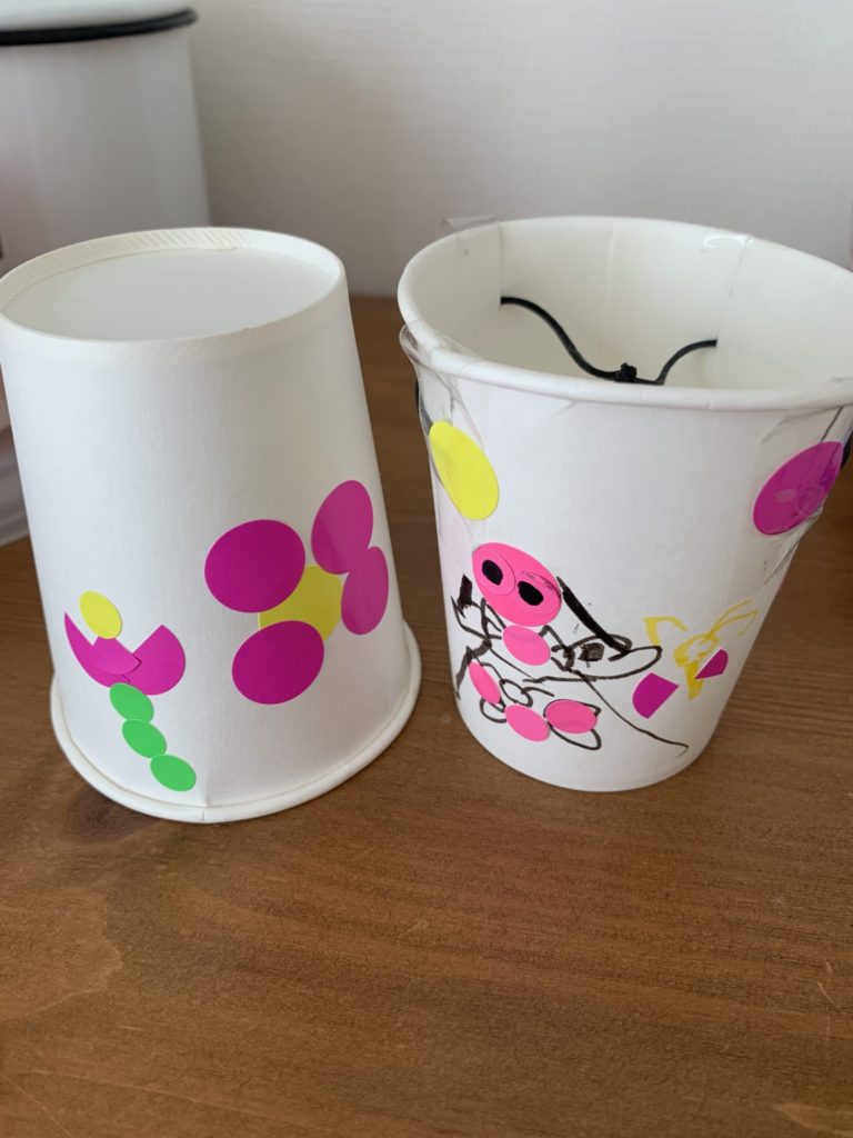 4、5枚目はシールで女の子やちょうちょ、お花などかいた紙コップロケットです。