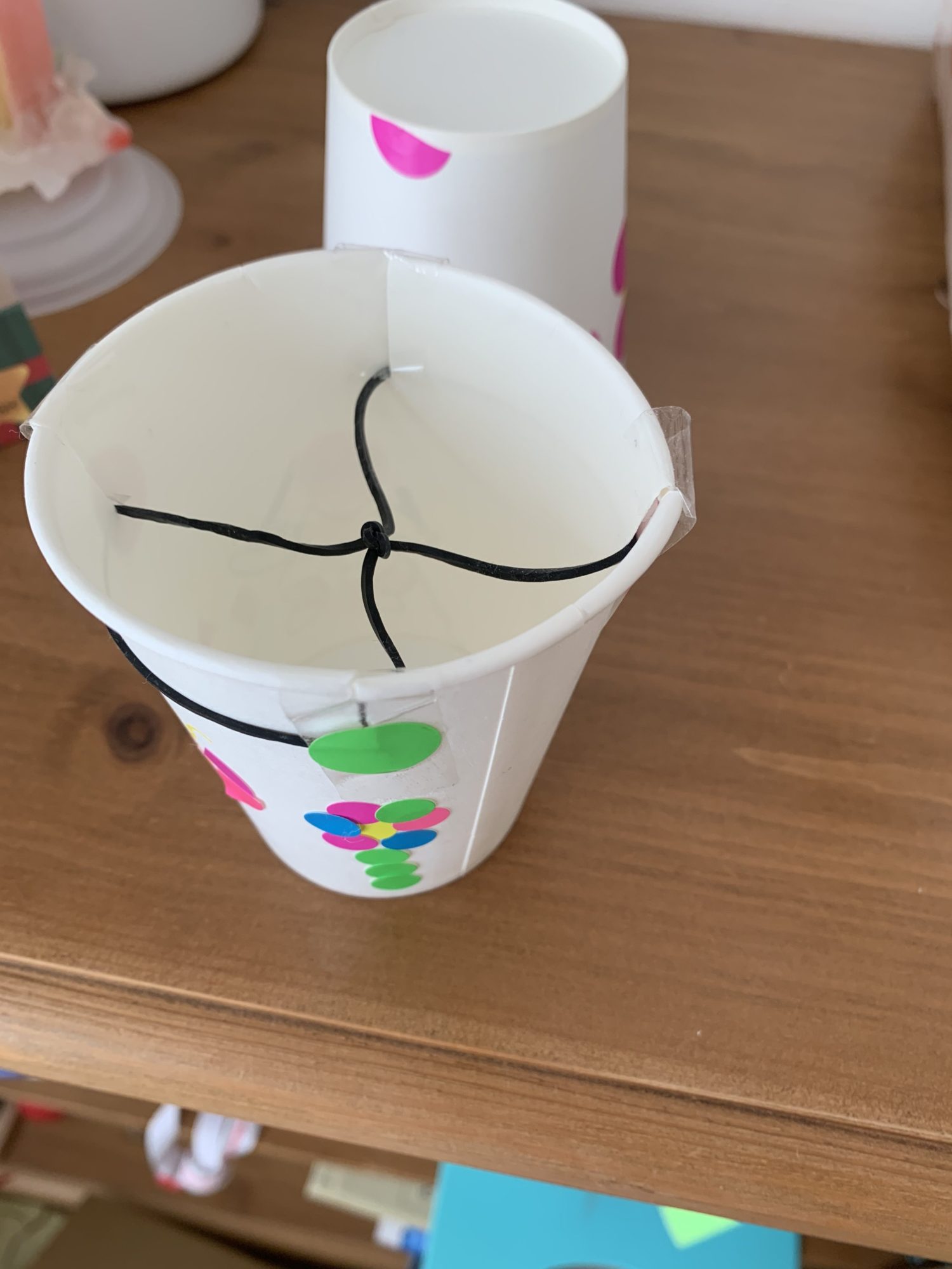 4、5枚目はシールで女の子やちょうちょ、お花などかいた紙コップロケットです。