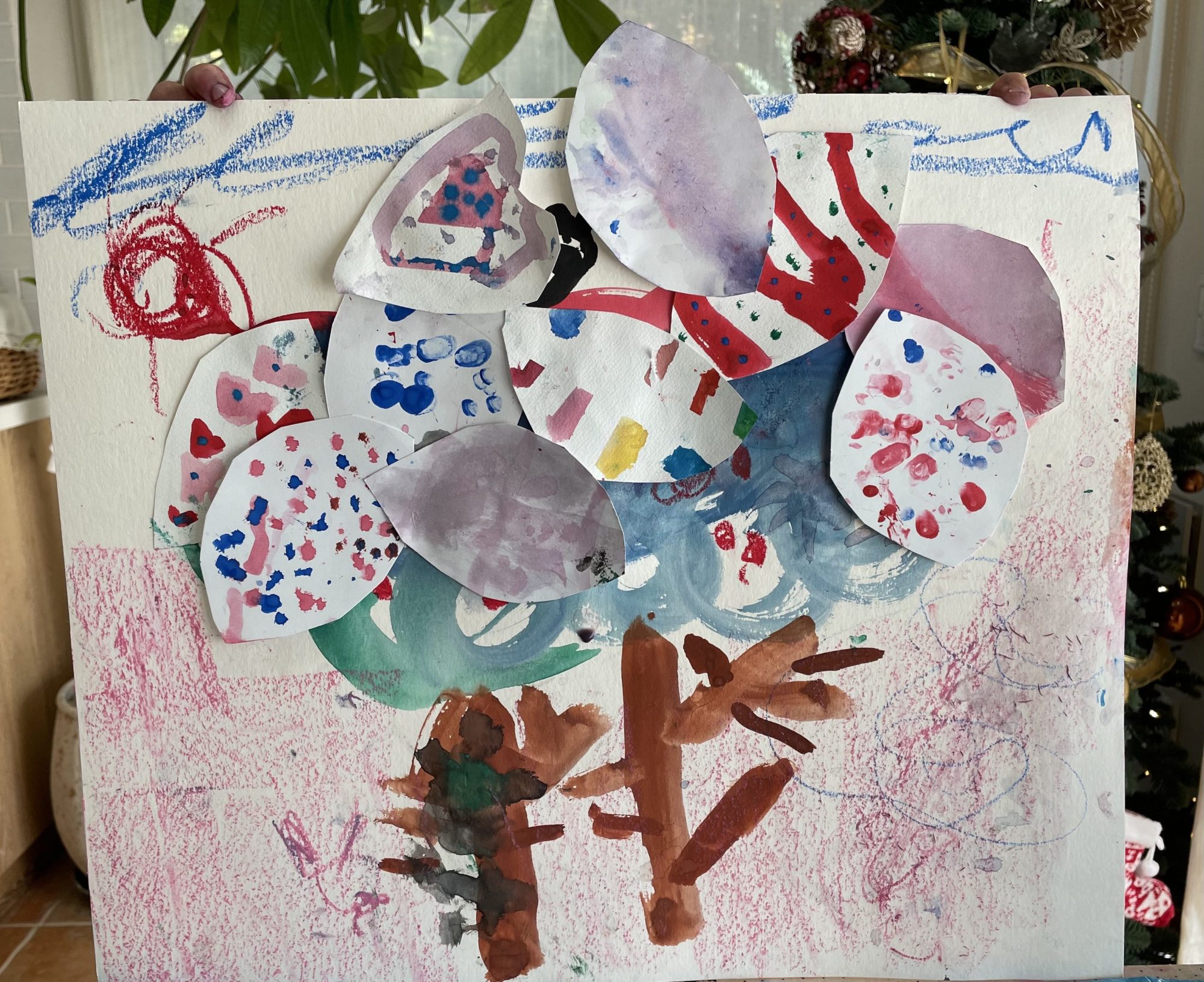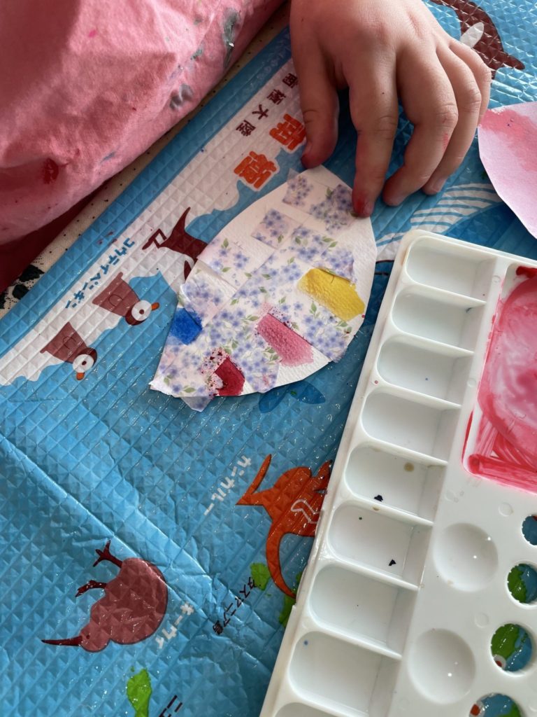 絵の具技や葉っぱの重ね貼り、クレヨンの塗り方にも工夫がたくさん隠れていて見ていてとっても楽しいです、