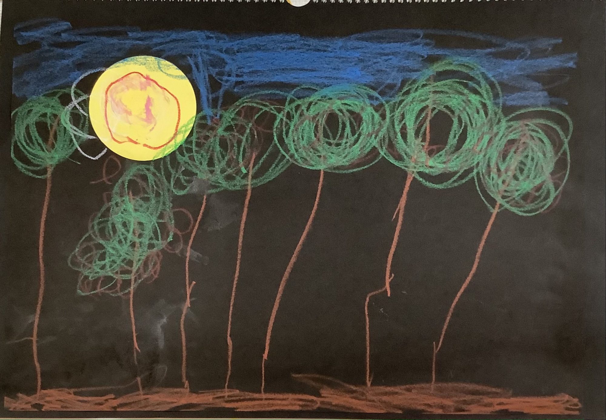 きとう 先生2023年5月10日 9:04 AM 黒いバックに 緑、青、茶色。とっても綺麗ですね。 夜でお月様が出ているので 黒い紙に描いたのですね。 いつもと違う素材で新しい発見があったのでは と感じる作品でした!とってもきれい!! ログインして返信する ↓
