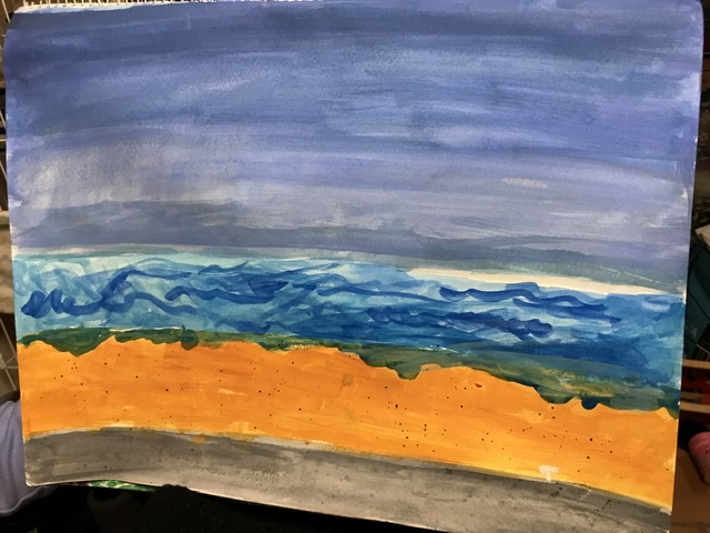 空を色を重ねて上を濃くして、波は色々描いてから上から薄い青をのせました。