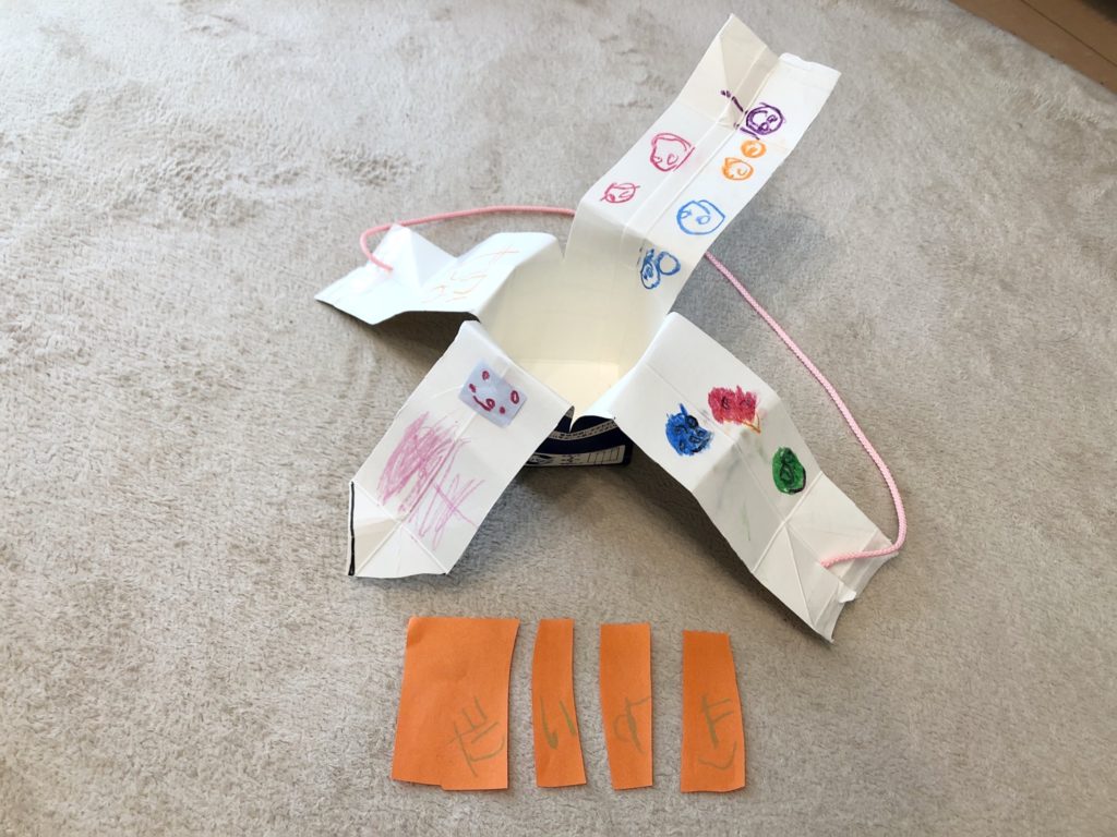 羽やしっぽには家族や祖父母、いとこ、いとこのお家にいる犬の顔を描きました。