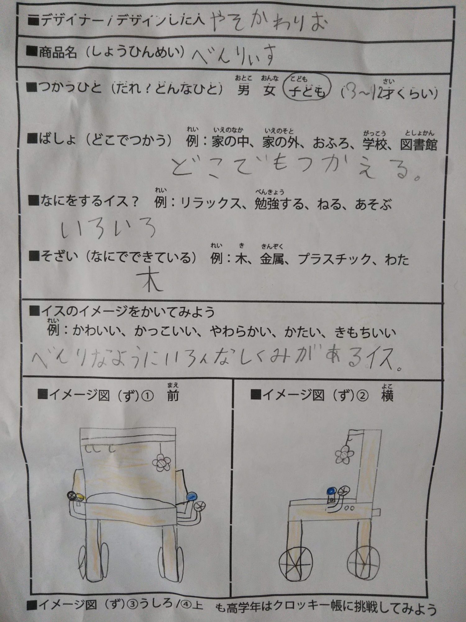べんりなようにいろいろなしくみのあるイスをつくりました。うしろにもたおせます!