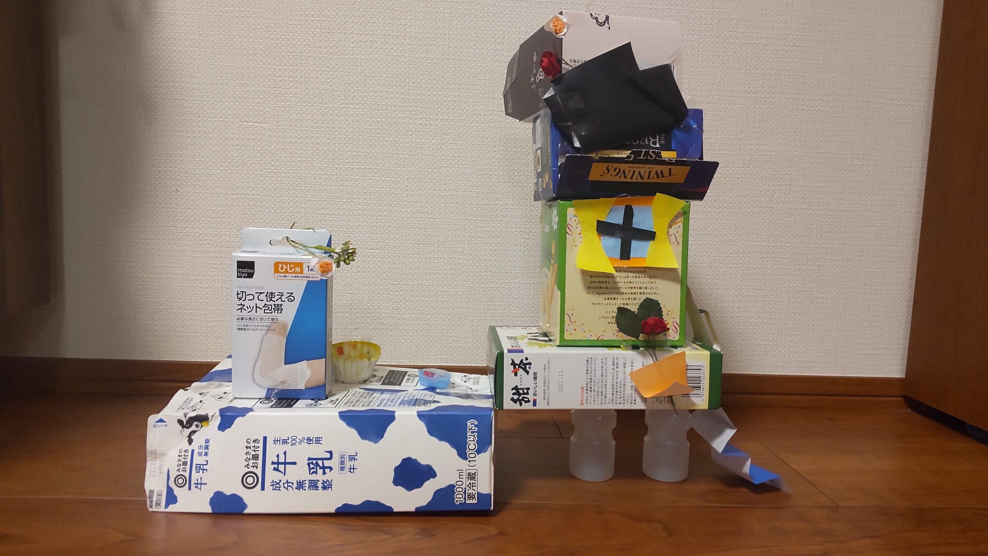 身の回りにある廃材を見立てながら構成して組み立てていく様子がすごい!とても高度なことをやられていますね!
