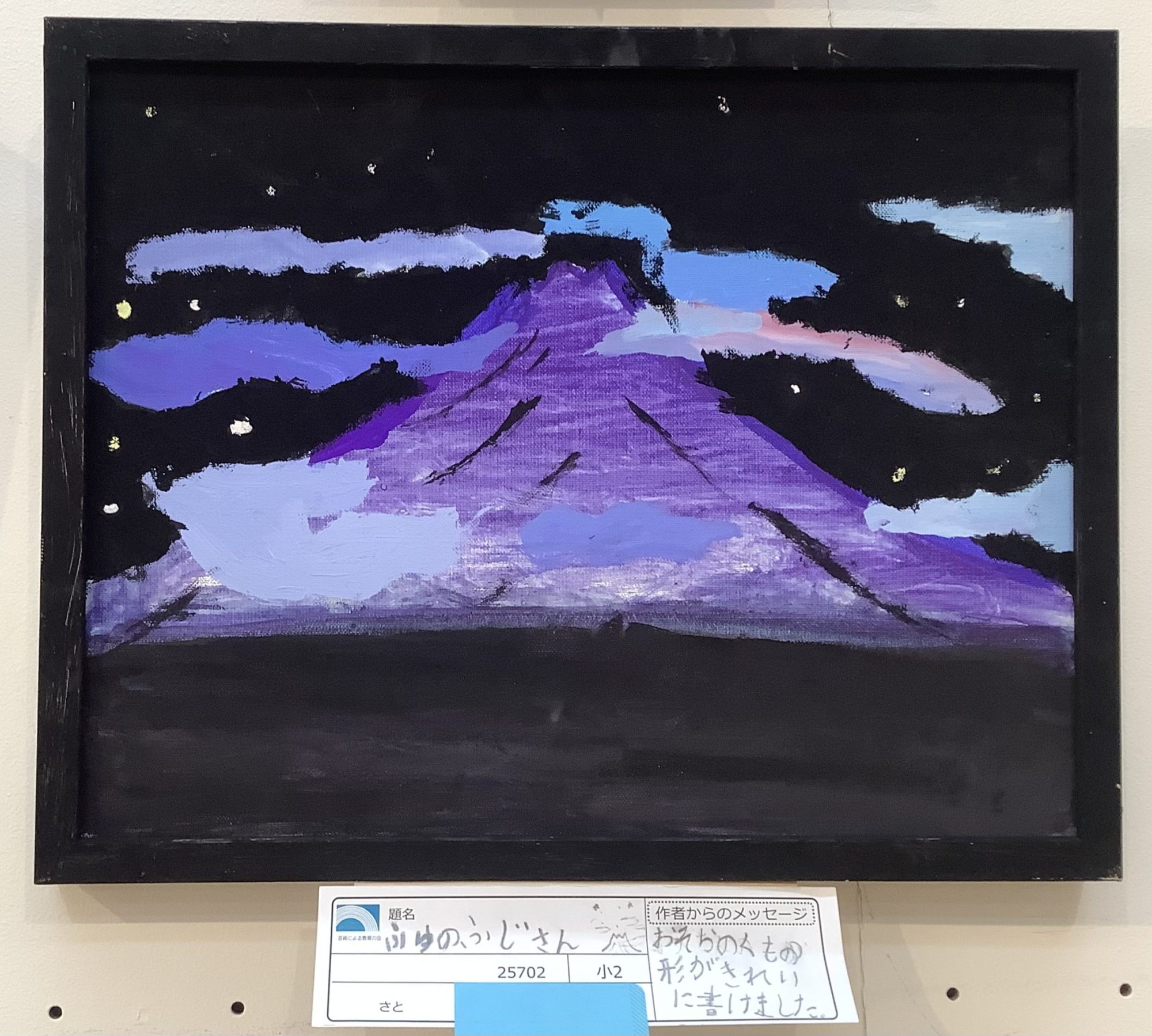 ゆうの先生 先生2022年1月8日 2:14 PM こんにちは!☀️ ふじさんをこんなに、みりょくてきにかけるなんて!!😳✨すごい…!😳 色のえらびかたが、すごくステキだなと思いました! よぞらをバックに、むらさきがかったふじさん! くもの形も色もとっても好きです! ふじさんをこんなふうにかける人、なかなかいないと思います!このさくひんのファンになりました!✨ ログインして返信する ↓