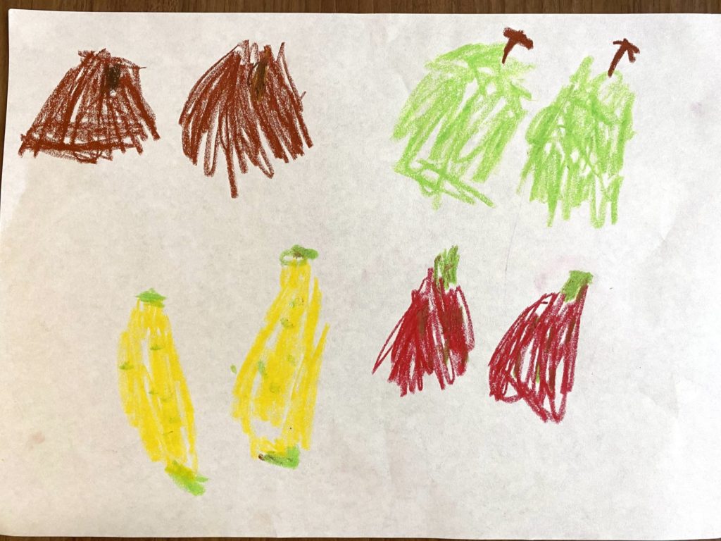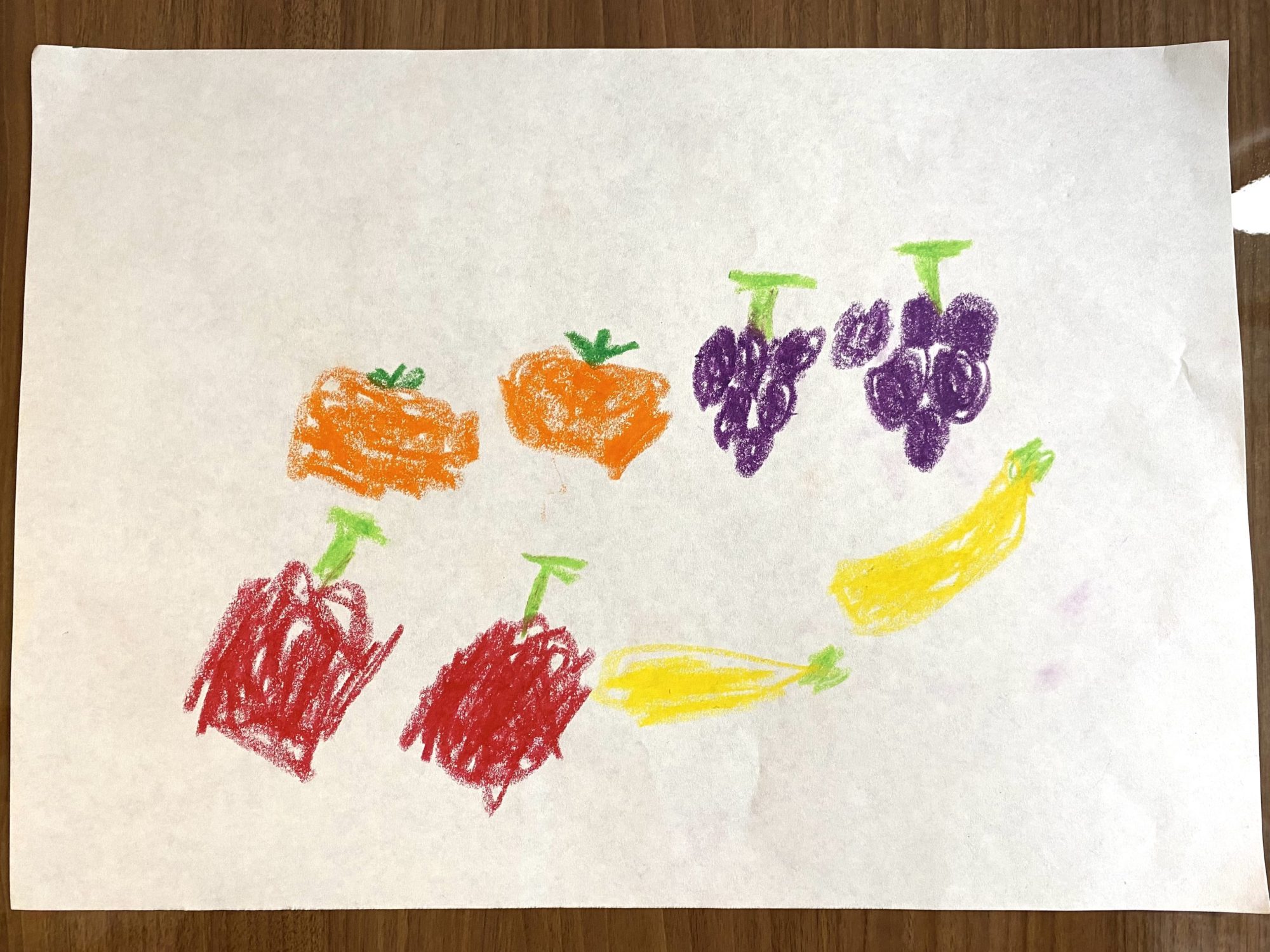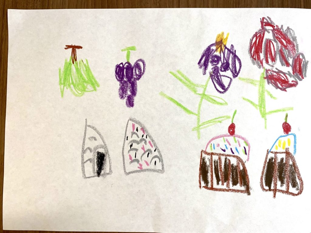1枚目・みかん、ぶどう、りんご、バナナ 2枚目・ココナッツ、なし、レモン、イチゴ 3枚目・なし、ぶどう、パンジー、薔薇、おにぎり、シャケおにぎり、五色スプレーカップケーキ、バナナカップケーキ