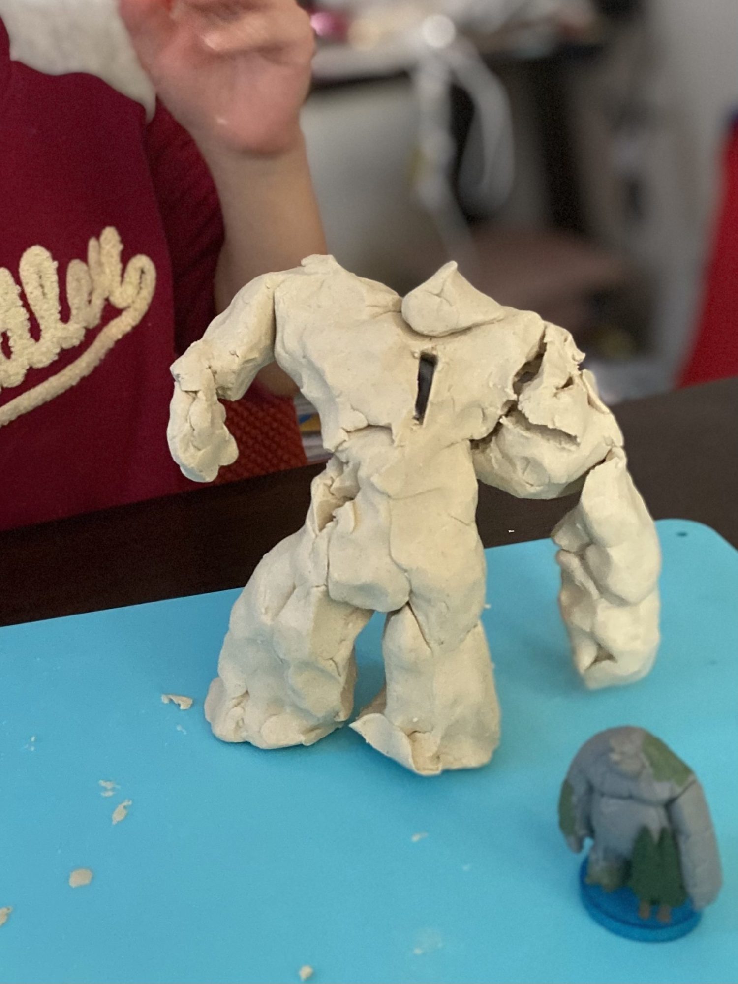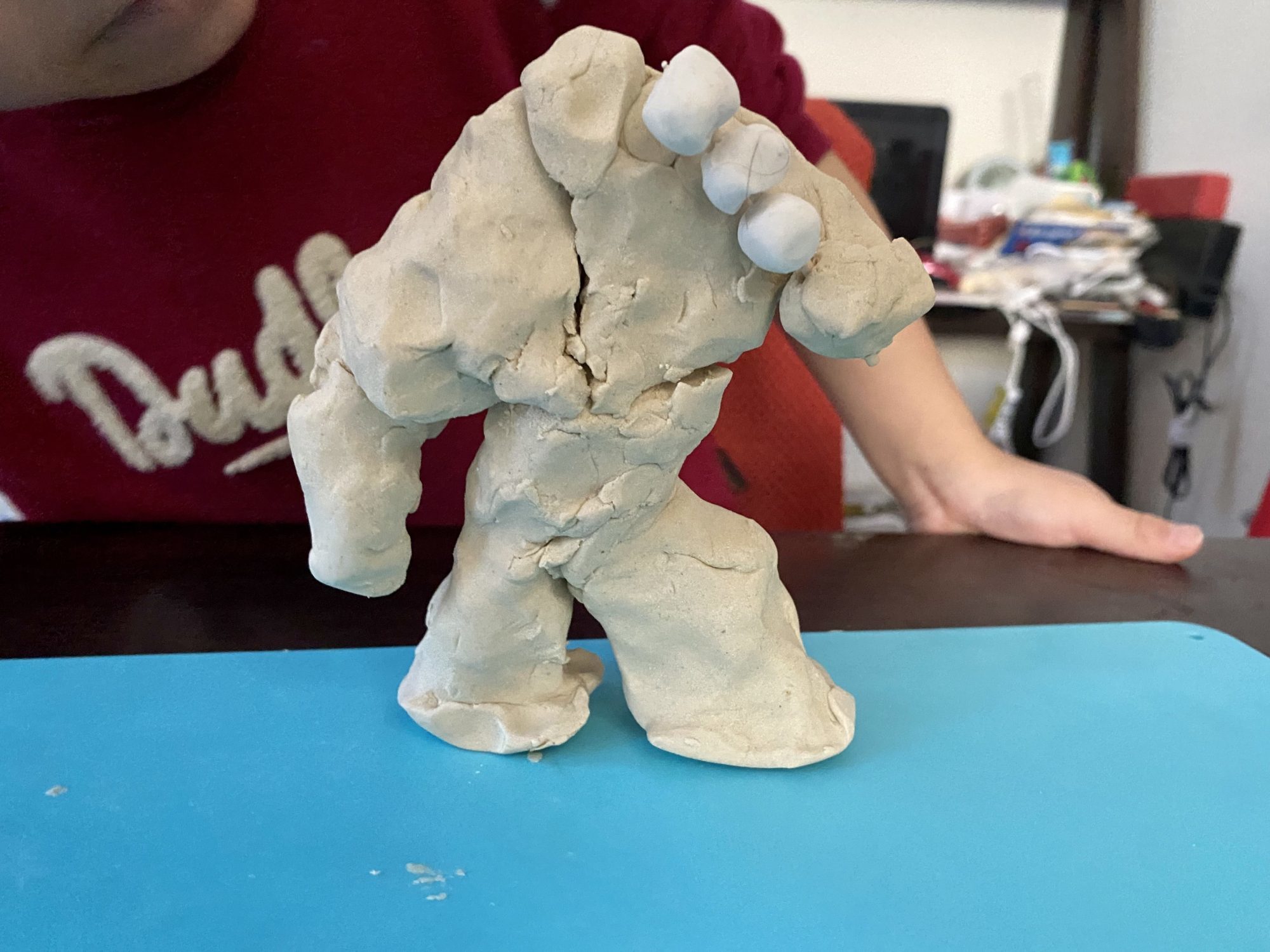 オンラインレッスンで、ねんどやりたいと言って、最初は恐竜を作って、そのあとはアース・ジャイアントを作って、弟が作った団子を食べて、パワーアップになるそうです。