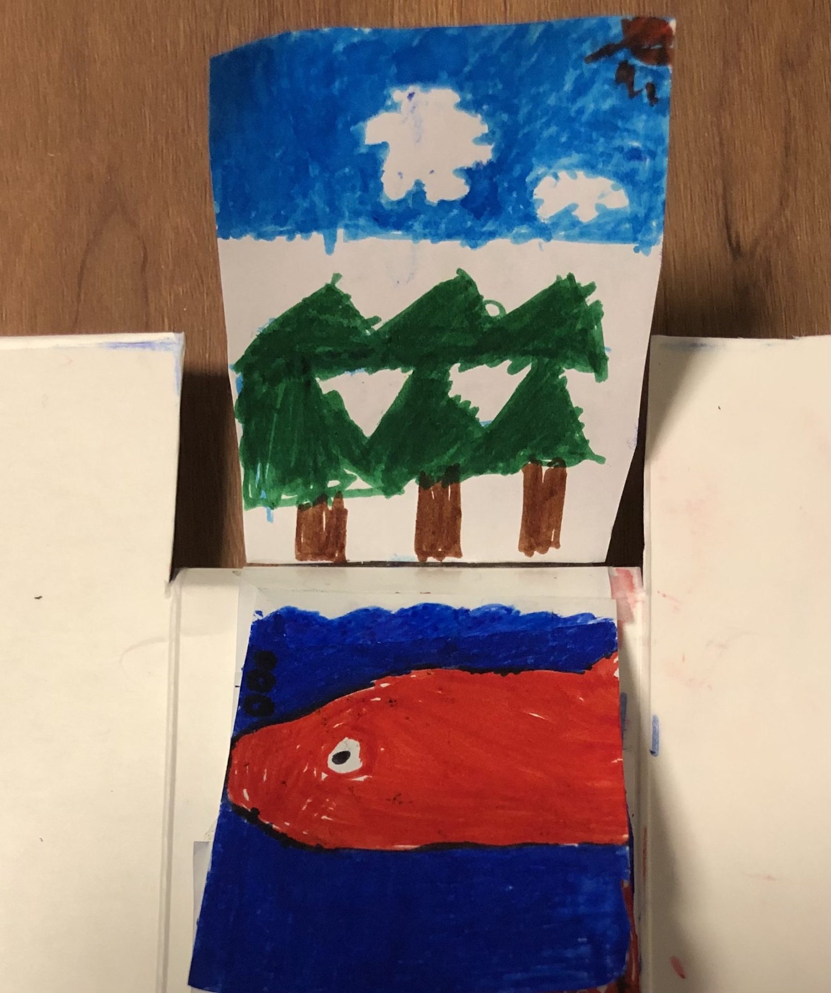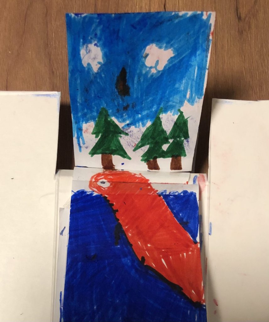 題名を考えることや、お話を作ること、色を塗りをがんばりました。