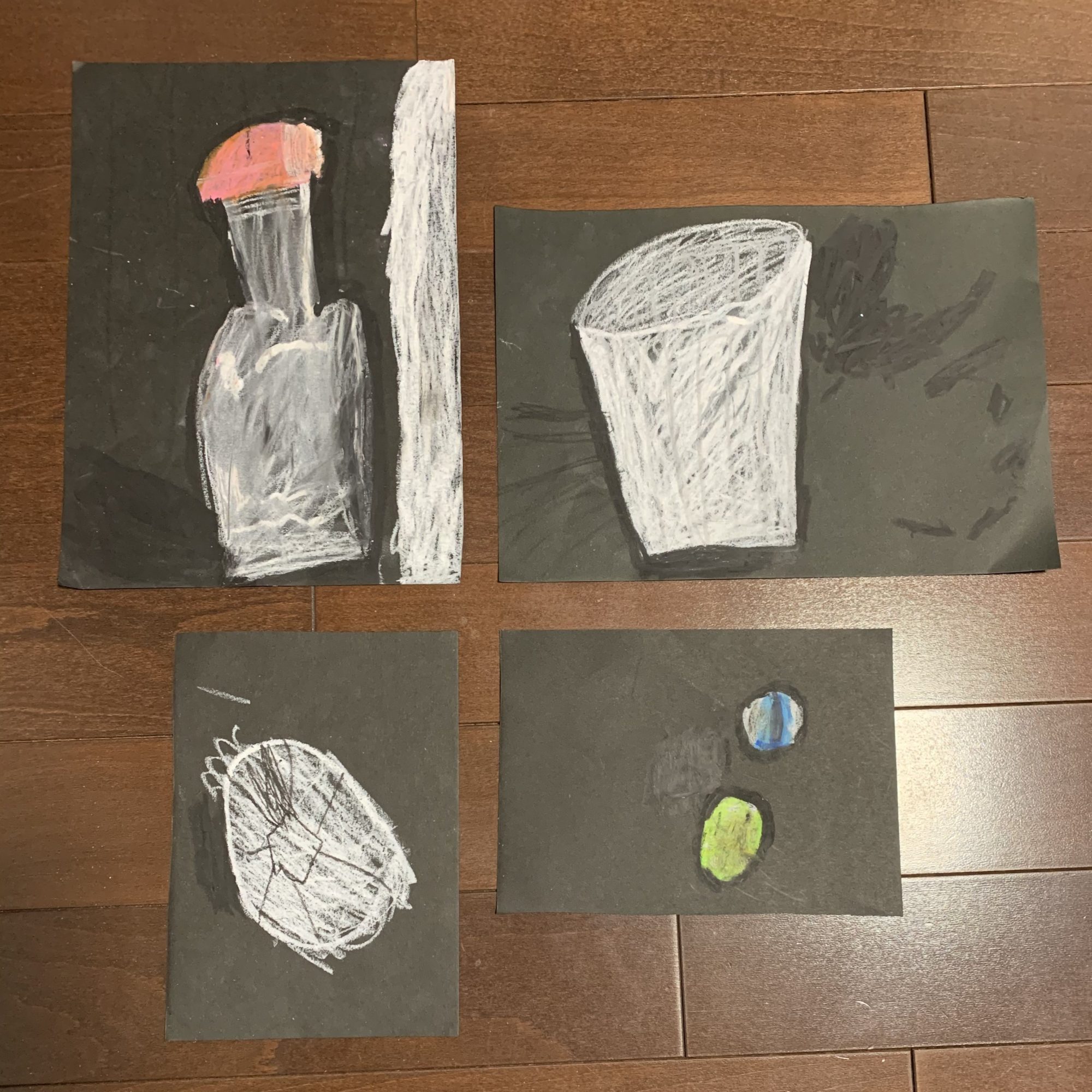 コップのかげや、ビンのとうめいかんなど、よく見て描いていることがつたわってきます!