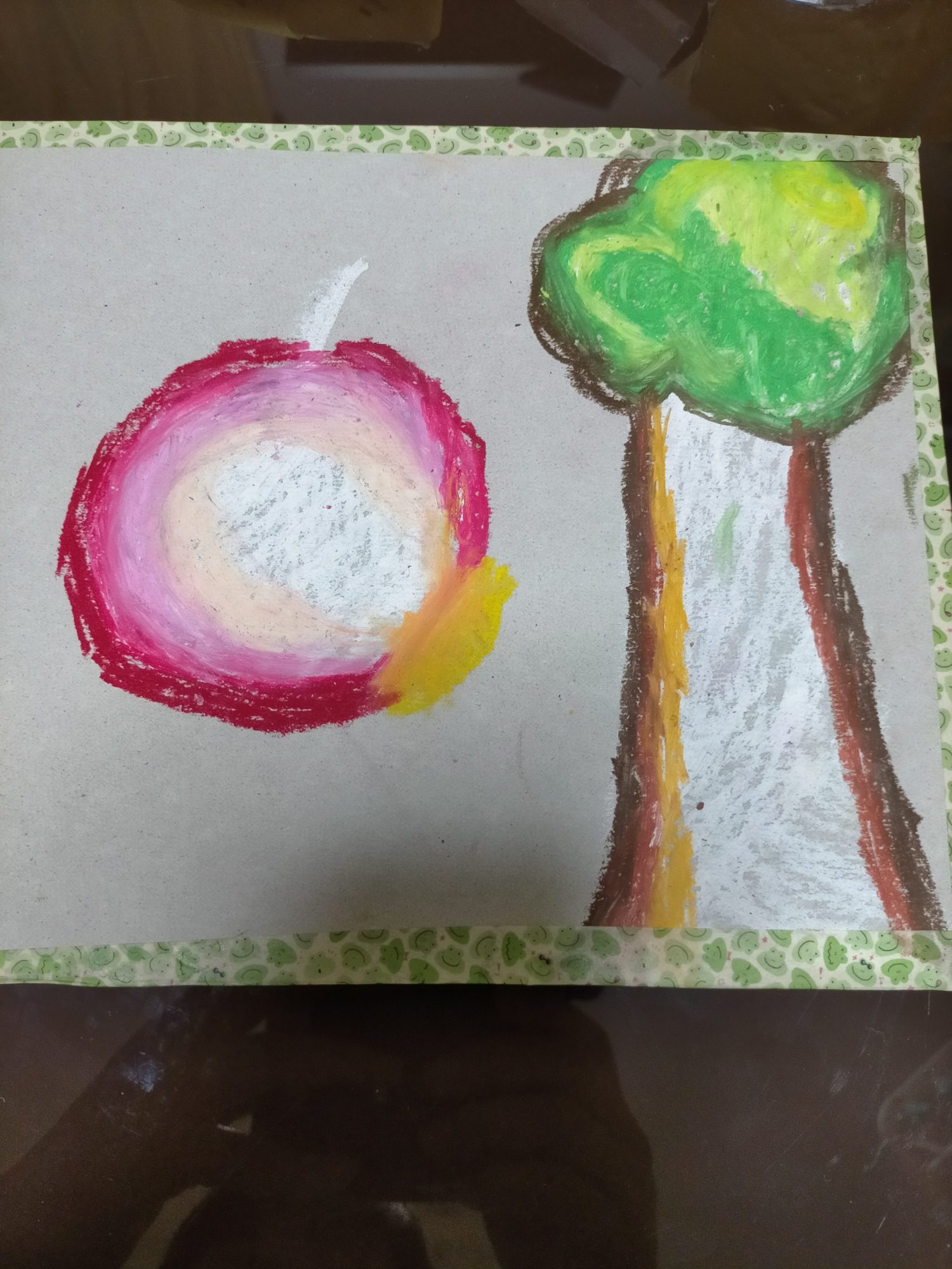 りんごと、木の幹、葉っぱの緑、の色のなかまを使い分けていますね!