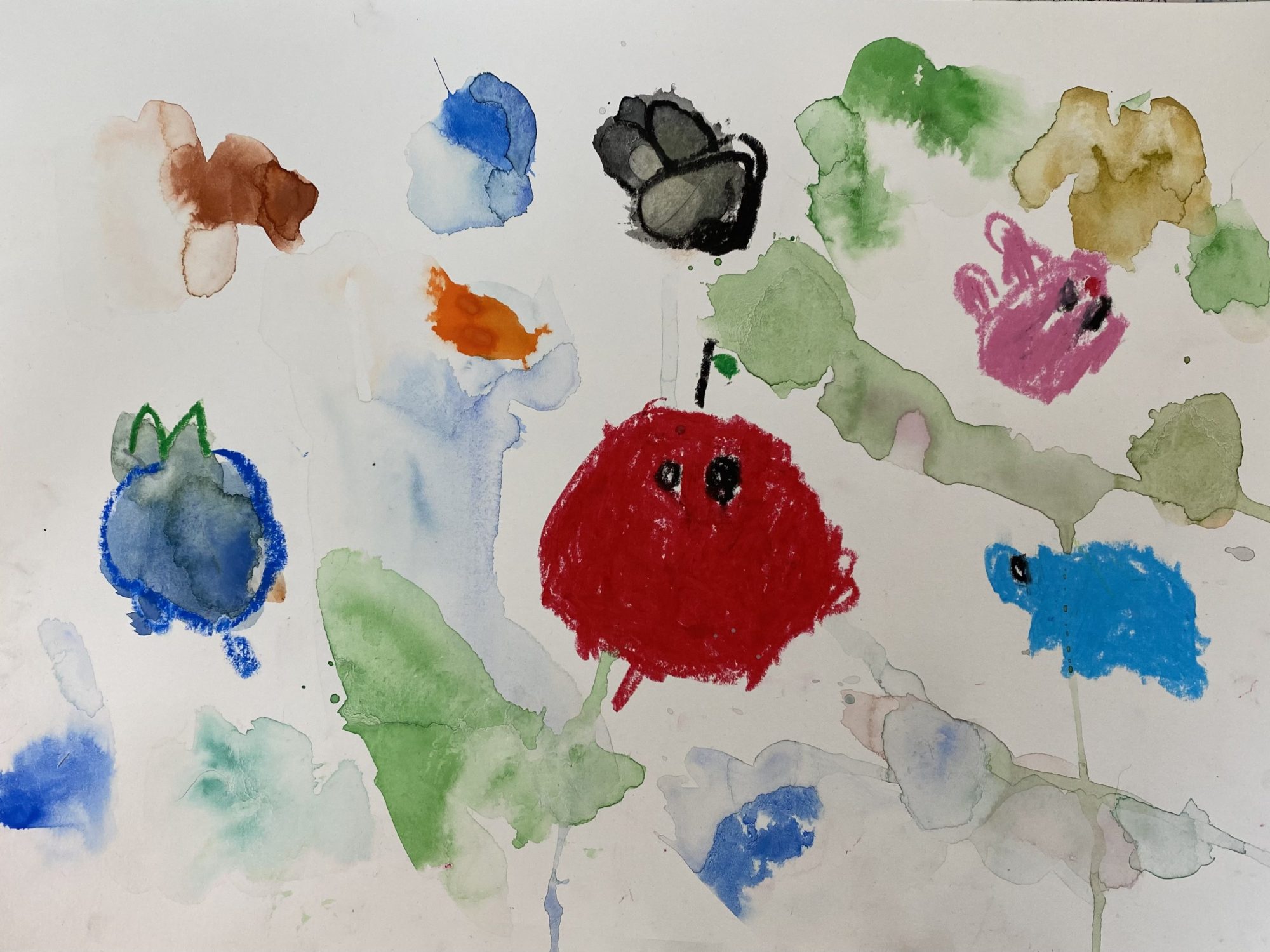 瑞々しい絵の具の表情と、クレヨンのパキッとした表情