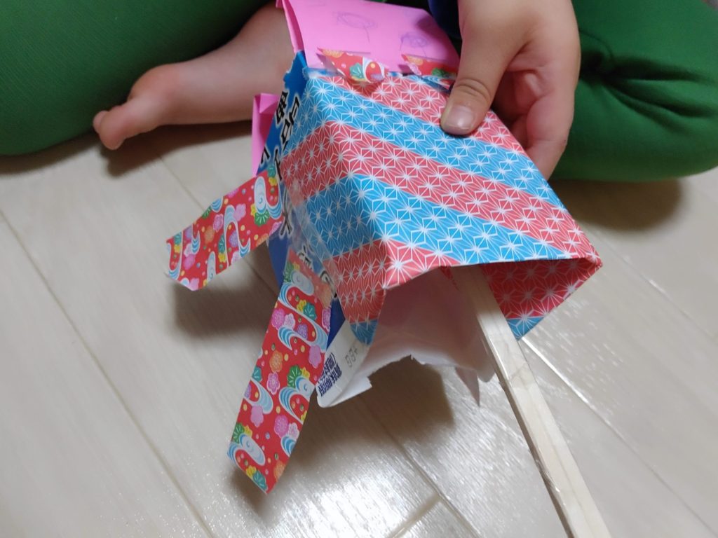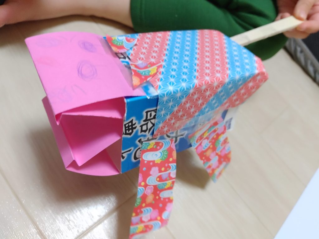 うしろあしがあし、まえあしがてです。おもちゃもたべものもつくりました。おもちゃはボールとぶらさげるやつ、たべものは、とうふとキャットフードとバナナとにんじんです。