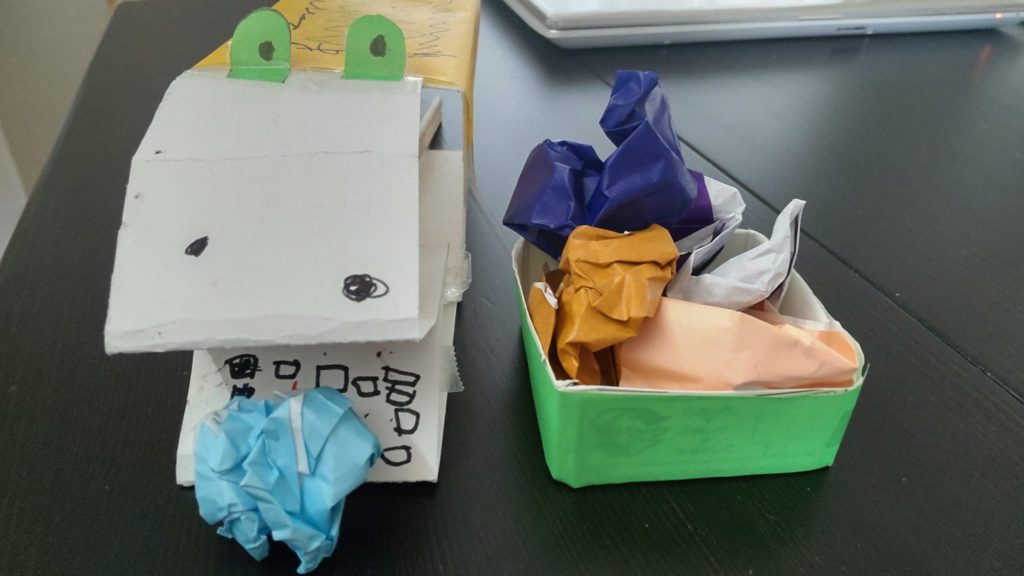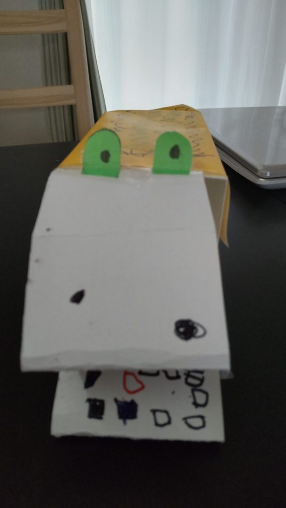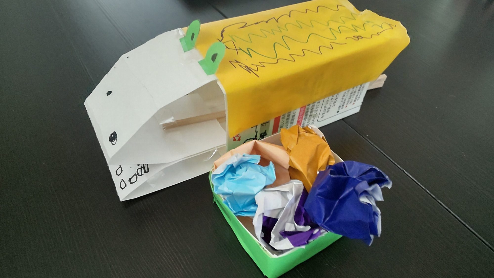 余った牛乳パックのそこ部分深さ2センチほどに折り紙を貼り付けて、ワニさんのエサ入れにしました。