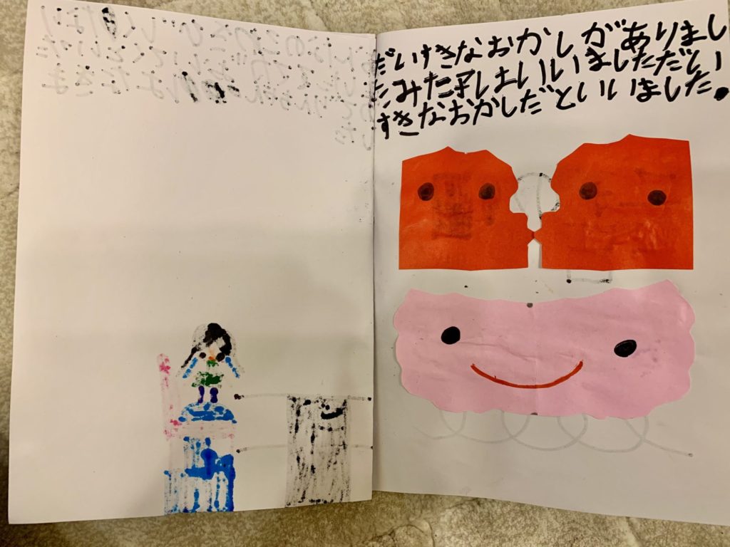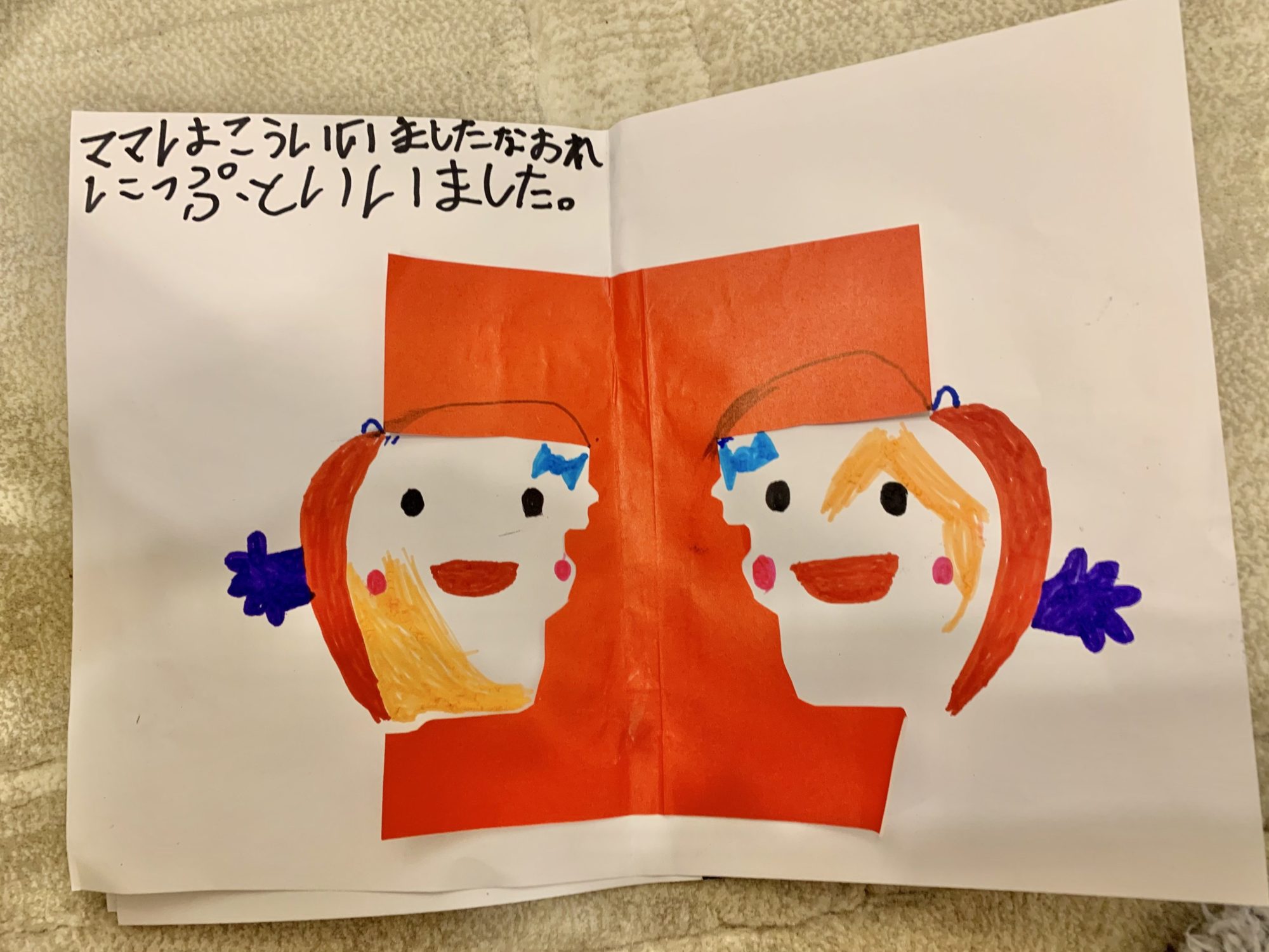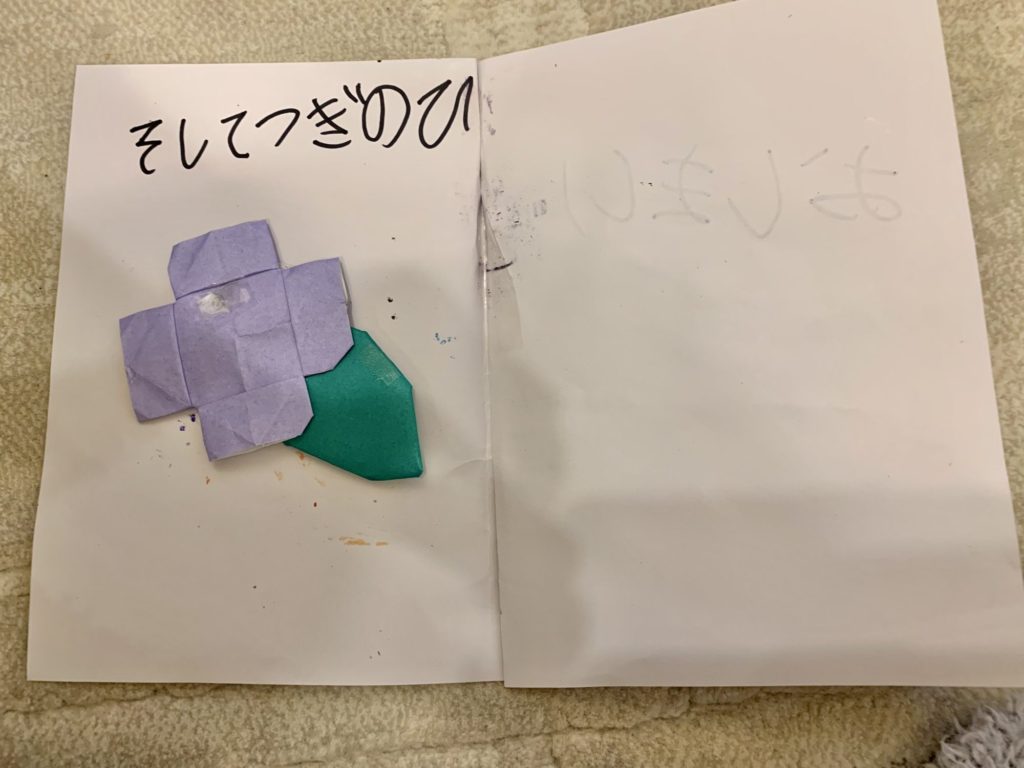 切り取られた折り紙の形が大変ユニークで、ふたごの表情もとてもよく描かれていますね。さいごのページの花と葉っぱも素敵です🧐