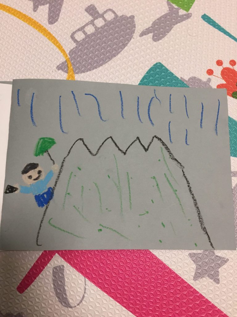 なみとくんがやまのぼりをしていたら、あめがふってきてたいへん やっとおうちにかえれました