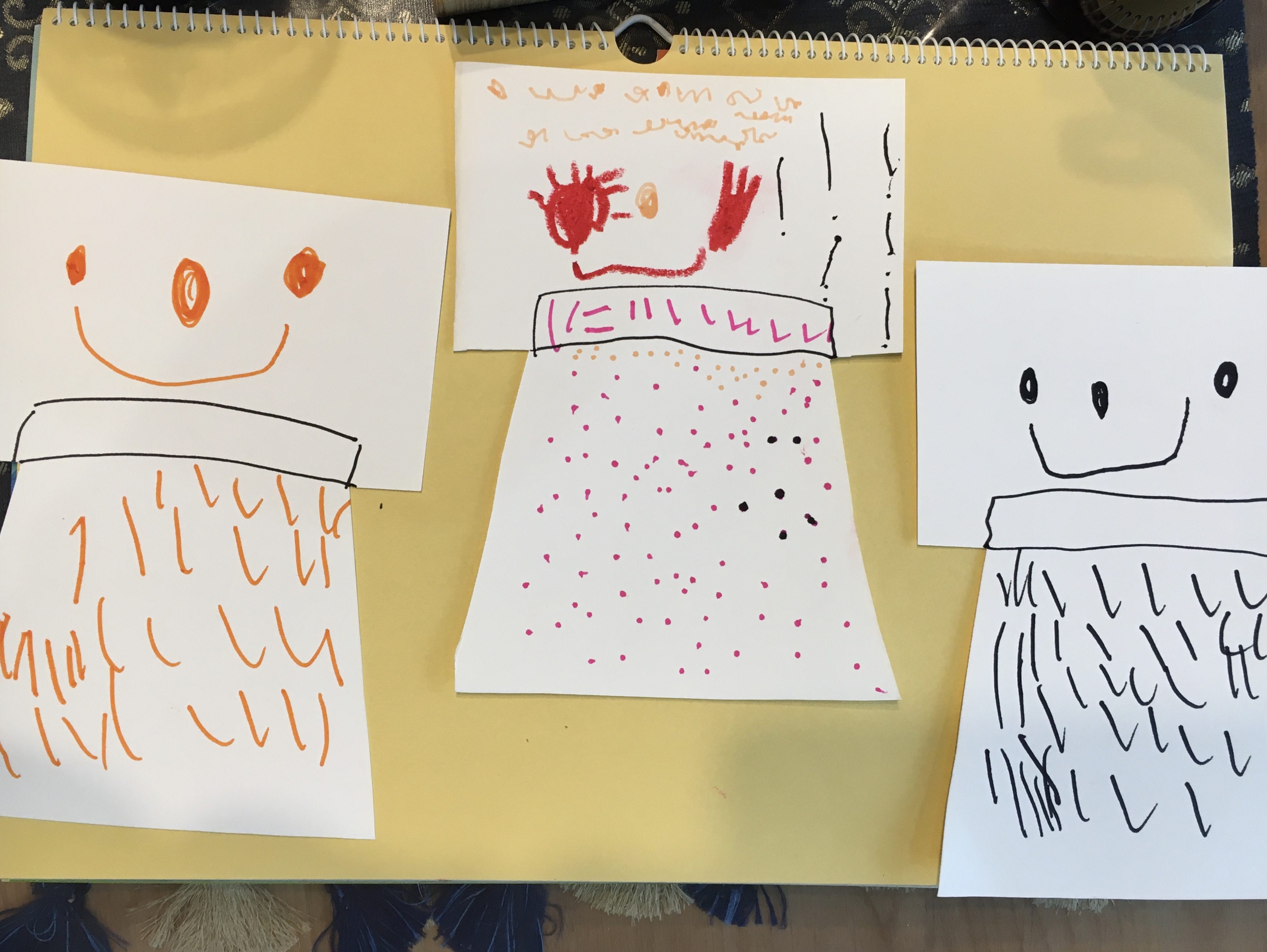 勢い良い線だけでなくおちついたリズムの模様も出てきて、お顔の個性もだんだん濃くなってきましたね!