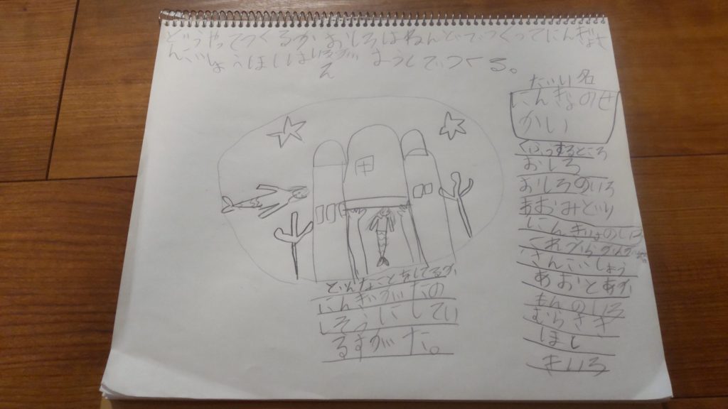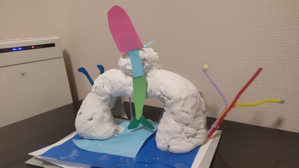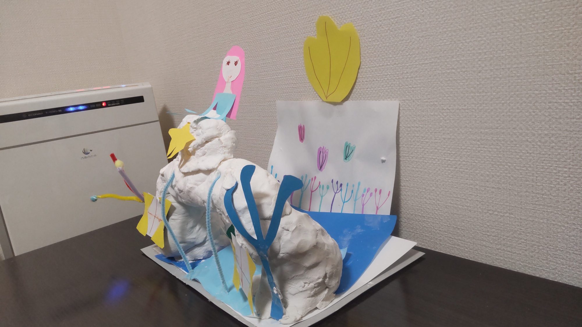 かみねんどでつくったおしろの門がすごくりっぱですね! うみのなかのフンイキですね! にんぎょのすがたもステキです。うしろからみてもちゃんと作られてる!